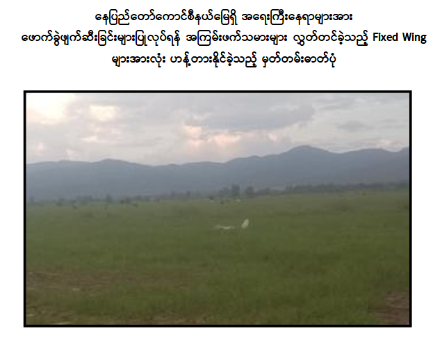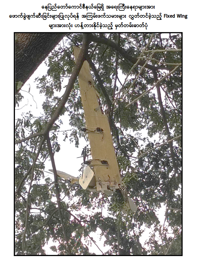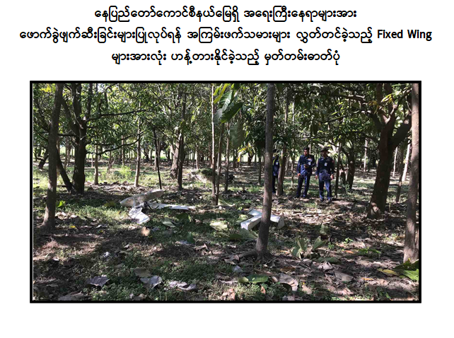နေပြည်တော်ကောင်စီနယ်မြေရှိ အရေးကြီးအဆောက်အဦများနှင့် နေရာဌာနများအား ဖောက်ခွဲဖျက်ဆီးရန်နှင့် ပြည်သူများ အထိတ်တလန့်ဖြစ်စေရန် ယုတ်မာကောက်ကျစ်သည့်အကြံအစည်များဖြင့် အကြမ်းဖက်သမားများသည် အရှေ့ဘက်အရပ်မှ ယနေ့နံနက်ပိုင်း လယ်ဝေးမြို့နယ်အတွင်းသို့ ဒေသန္တရလုပ် Fixed Wing အချို့ စမ်းသပ်ပစ်လွှတ်ခြင်းဖြင့် အကြမ်းဖက်ဖောက်ခွဲရေးလုပ်ရပ်များ လုပ်ဆောင်နိုင်ရန် ကြံစည်ကြိုးပမ်းလာခဲ့သည်။