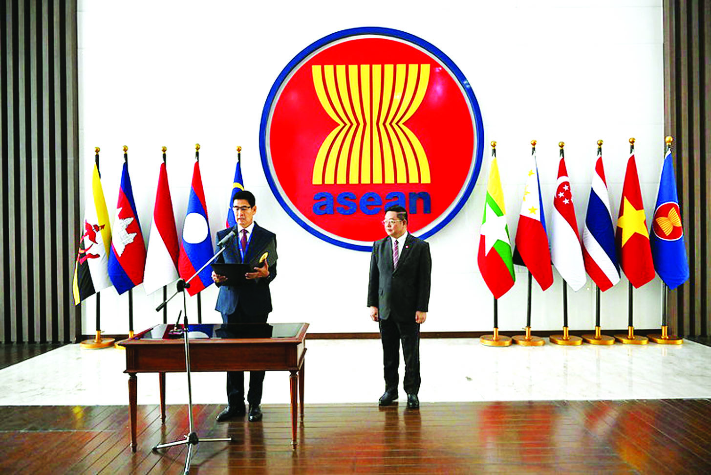 အာဆီယံအတွင်းရေးမှူးချုပ် ဒေါက်တာကောင်ကင်မ်ဟွန်က သံအမတ်ကြီး(ငြိမ်း) ဦးစံလွင်အား အာဆီယံအတွင်းရေးမှူးချုပ်ရုံး၌ နိုဝင်ဘာ ၁ ရက်က တွေ့ဆုံနှုတ်ဆက်ခဲ့ပြီး ကျမ်းသစ္စာကျိန်ဆိုသည့်အခမ်းအနား ကျင်းပပြုလုပ်ကာ အာဆီယံအတွင်းရေးမှူးချုပ်က လူမှု-ယဉ်ကျေးမှု အသိုက်အဝန်းမဏ္ဍိုင်အောက်မှ ဆောင်ရွက်လျက်ရှိသည့် လုပ်ငန်းစဉ်များကို ရှင်းလင်းပြောကြားသည်။