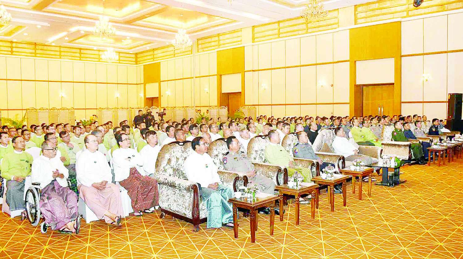 စက်တင်ဘာ ၁၀ ရက်မှ ၁၂ ရက်အထိ ရာဂီတိုင်ဖွန်းမုန်တိုင်းအရှိန်ကြောင့် နေပြည်တော်၊ တိုင်းဒေသကြီးနှင့် ပြည်နယ်အချို့တွင် ရေကြီးရေလျှံမှုများ ဖြစ်ပေါ်ခဲ့ရာ အထွေထွေအုပ်ချုပ်ရေးဦးစီးဌာန ဝန်ထမ်းများသည် သက်ဆိုင်ရာ ခရိုင်/ မြို့နယ်သဘာဝဘေး အန္တရာယ်ဆိုင်ရာ စီမံခန့်ခွဲမှုအဖွဲ့များနှင့်အတူ ထဲထဲဝင်ဝင် ပူးပေါင်းဆောင်ရွက်နိုင်ခဲ့သည့်အပေါ် ဌာနအနေဖြင့် များစွာဂုဏ်ယူရမည်ဖြစ်ကြောင်း ယခုနှစ် အောက်တိုဘာ ၁ ရက်မှ ၁၅ ရက် အထိ လူဦးရေနှင့် အိမ်အကြောင်းအရာကိန်းဂဏန်း၊ အချက်အလက်များကို နိုင်ငံတစ်ဝန်း တစ်ပြိုင်တည်း ကွင်းဆင်းကောက်ယူခဲ့ရာတွင် အထွေထွေအုပ်ချုပ်ရေးဦးစီးဌာန ဝန်ထမ်းများက သက်ဆိုင်ရာ ဌာန/ အဖွဲ့အစည်းများနှင့် ပူးပေါင်းပါဝင်ပြီး အောင်မြင်အောင် ဆောင်ရွက်နိုင်ခဲ့သည်ကိုလည်း တွေ့မြင်ကြရမည်ဖြစ်ကြောင်း၊ နိုင်ငံတော်ကချမှတ်ထားသည့် အမျိုးသားရေး ရည်မှန်းချက် (၂) ရပ်၊ နိုင်ငံရေးရည်မှန်းချက် (၂) ရပ်၊ ရှေ့လုပ်ငန်းစဉ် (၅) ရပ်နှင့် ဦးတည်ချက် (၉) ရပ်တို့ကို “မူဝါဒ” အဖြစ်ခံယူပြီး ကျရာအခန်းကဏ္ဍမှ စိတ်ရင်းစေတနာအမှန်ဖြင့် အကောင်အထည်ဖော် ဆောင်ရွက်ကြ ရန်ဖြစ်ကြောင်း၊ လွတ်လပ်ပြီးတရားမျှတသည့် အထွေထွေရွေးကောက်ပွဲကြီး အောင်မြင်စွာကျင်းပနိုင်ရေးအတွက် အရာထမ်း၊ အမှုထမ်းများအနေဖြင့် လိုအပ်သည့်အခန်းကဏ္ဍမှပါဝင်၍ ပူးပေါင်းဆောင်ရွက်သွားကြရန်ဖြစ်ကြောင်း၊ နိုင်ငံ့အကျိုးကို အစဉ်သယ်ပိုးနိုင်ပြီး အရည်အသွေးပြည့်ဝသည့် အုပ်ချုပ်ရေးဝန်ထမ်းကောင်းများဖြစ်အောင် ကြိုးပမ်းဆောင်ရွက်စေလိုကြောင်း ပြောကြားသည်။