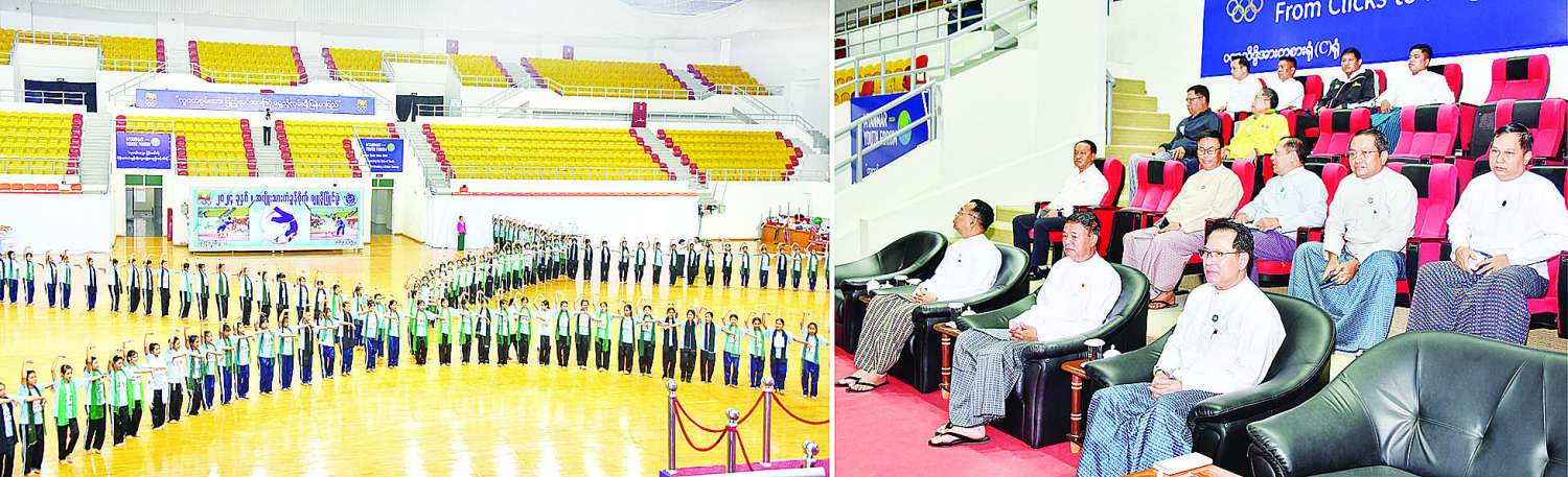 ပြန်ကြားရေးဝန်ကြီးဌာန ပြည်ထောင်စုဝန်ကြီး ဦးမောင်မောင်အုန်း၊ အားကစားနှင့်လူငယ်ရေးရာဝန်ကြီးဌာန ပြည်ထောင်စုဝန်ကြီး ဦးမင်းသိန်းဇံနှင့် တာဝန်ရှိသူများသည် ယနေ့နံနက်ပိုင်းတွင် နေပြည်တော်ရှိ ဝဏ္ဏသိဒ္ဓိအားကစားကွင်း (C) ရုံ၌ ပဉ္စမအကြိမ် အမျိုးသားအားကစားပွဲတော် ဖွင့်ပွဲအခမ်းအနားတွင် အကအလှများဖြင့် မြိုင်မြိုင်ဆိုင်ဆိုင် ပါဝင်ဆင်နွှဲဖျော်ဖြေတင်ဆက်ကြမည့် ကျောင်းသူများ၏ ကြိုတင်ပြင်ဆင်လေ့ကျင့်နေမှုကို ကြည့်ရှုအားပေးကြသည်။