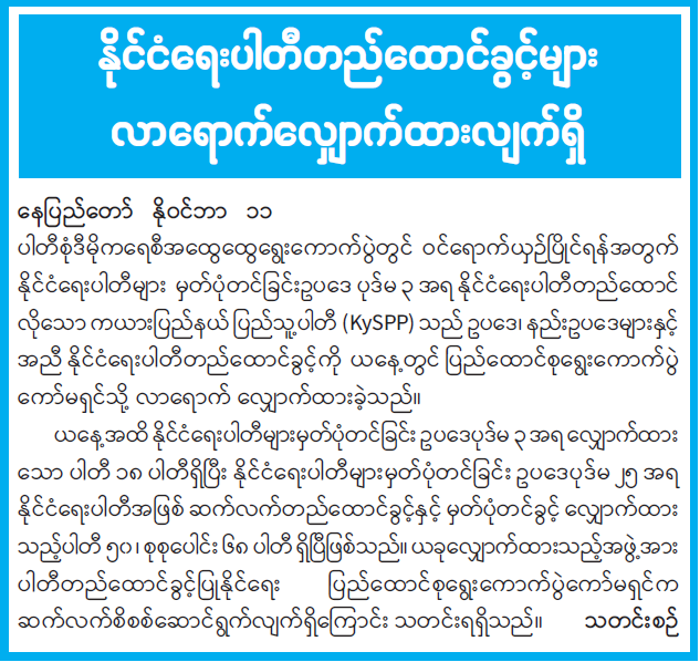 ပါတီစုံဒီမိုကရေစီအထွေထွေရွေးကောက်ပွဲတွင် ဝင်ရောက်ယှဉ်ပြိုင်ရန်အတွက် နိုင်ငံရေးပါတီများ မှတ်ပုံတင်ခြင်းဥပဒေ ပုဒ်မ ၃ အရ နိုင်ငံရေးပါတီတည်ထောင်လိုသော ကယားပြည်နယ် ပြည်သူ့ပါတီ (KySPP)သည် ဥပဒေ၊ နည်းဥပဒေများနှင့်အညီ နိုင်ငံရေးပါတီတည်ထောင်ခွင့်ကို ယနေ့တွင် ပြည်ထောင်စုရွေးကောက်ပွဲကော်မရှင်သို့ လာရောက်လျှောက်ထားခဲ့သည်။