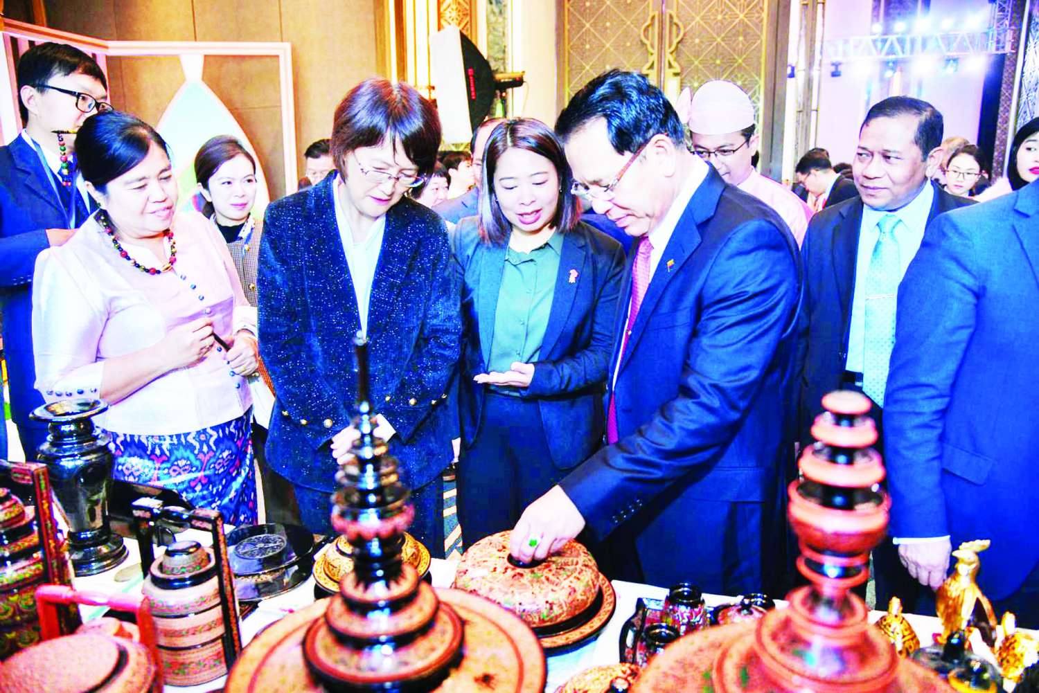 ဖွင့်ပွဲအခမ်းအနားအပြီးတွင် ဧည့်သည်တော်များနှင့် အကြီးအကဲများက ဟိုတယ်အတွင်း ခင်းကျင်းပြသထားသည့် သမဝါယမနှင့် ကျေးလက်ဖွံ့ဖြိုးရေးဝန်ကြီးဌာနမှ ယွန်းထည်လက်မှုပညာပြခန်း၊ ဟိုတယ်နှင့်ခရီးသွားလာရေးဝန်ကြီးဌာနမှ မြန်မာနိုင်ငံဆိုင်ရာ သဘာဝရှုခင်းများ၊ ယဉ်ကျေးမှု၊ မြန်မာ-တရုတ် ပူးပေါင်းဆောင်ရွက်မှုဆိုင်ရာ ဓာတ်ပုံပြခန်းများအပါအဝင် ယူနန်ပြည်နယ်မှ ထုတ်ကုန်များကို လှည့်လည်ကြည့်ရှုအားပေးကြပြီး သာသနာရေးနှင့် ယဉ်ကျေးမှုဝန်ကြီးဌာနမှ ရုပ်သေးအကအဖွဲ့နှင့် ယူနန်ပြည်နယ်မှ ရုပ်သေးအကတို့ ယှဉ်တွဲဖျော်ဖြေမှုကို ကြည့်ရှုအားပေးခဲ့ကြသည်။