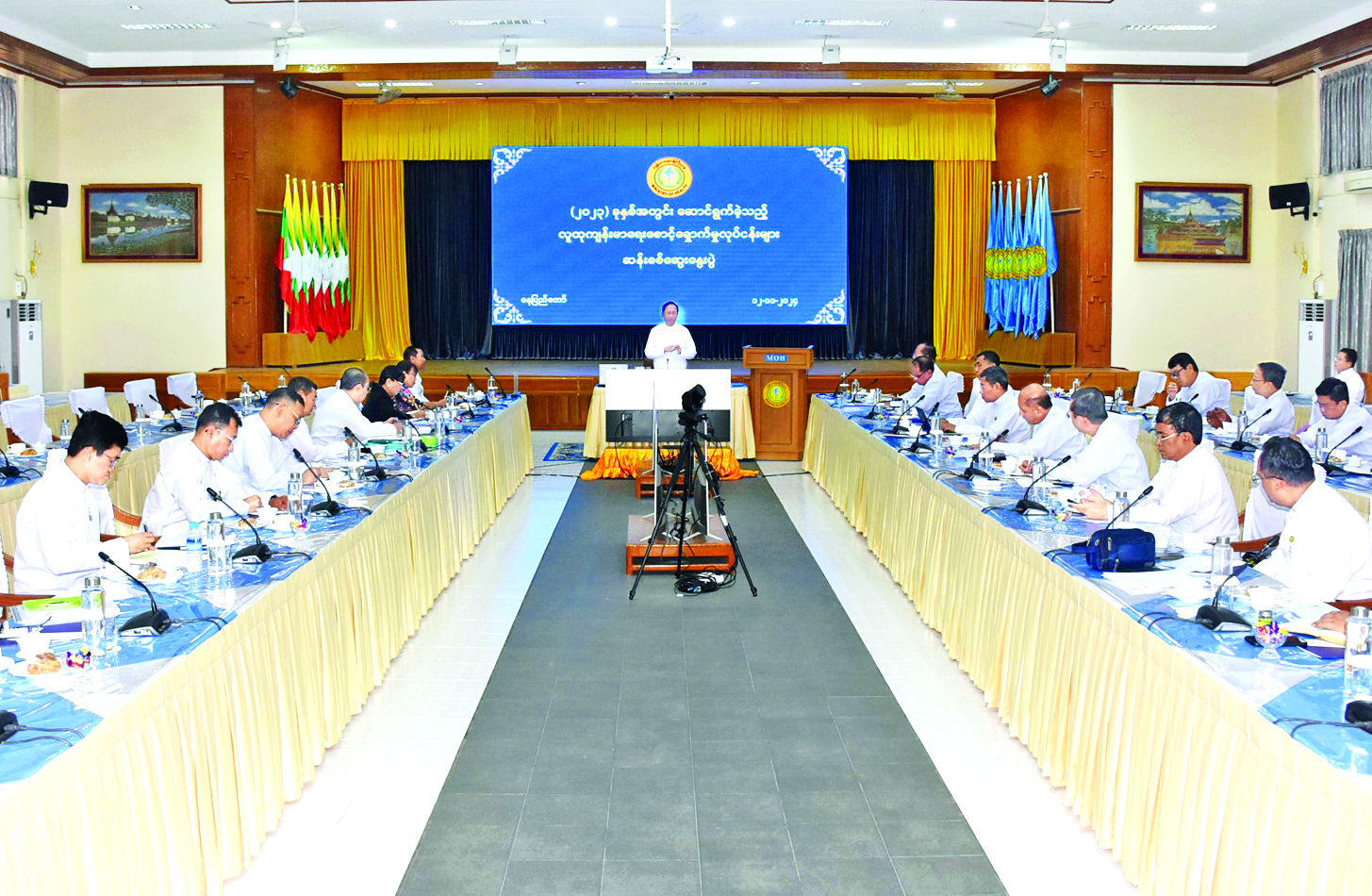 နေပြည်တော်ကောင်စီနယ်မြေ တိုင်းဒေသကြီး/ပြည်နယ်၊ ခရိုင်နှင့် မြို့နယ်များတွင် ၂၀၂၃ ခုနှစ်အတွင်း အကောင်အထည်ဖော်ဆောင်ရွက်ခဲ့သော လူထုကျန်းမာရေး စောင့်ရှောက်မှုလုပ်ငန်းများကို ပြန်လည်ဆန်းစစ်ရန်အတွက် ဗဟိုအဆင့် လူထုကျန်းမာရေးစောင့်ရှောက်မှုလုပ်ငန်း ဆန်းစစ်ဆွေးနွေးပွဲကို ယနေ့ နံနက် ၉ နာရီတွင် ကျန်းမာရေးဝန်ကြီးဌာနအစည်းအဝေးခန်းမ၌ ကျင်းပသည်။