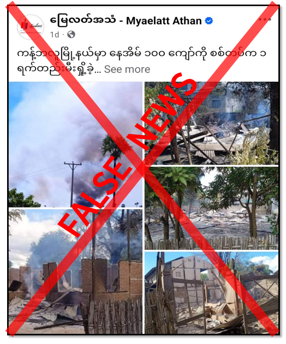 စစ်ကိုင်းတိုင်းဒေသကြီး၊ ကန့်ဘလူမြို့နယ်တွင် လုံခြုံရေးတပ်ဖွဲ့ဝင်များက နိုဝင်ဘာလ (၁၃) ရက်က နေအိမ် (၁၀၀) ကျော်ကို မီးရှို့ဖျက်ဆီးခဲ့ကြောင်း တရားမဝင် ပြည်ဖျက်မီဒီယာများက မဟုတ်မမှန် သတင်းတု၊ သတင်းအမှားများ ရေးသားဖြန့်ဝေနေသည်ကို တွေ့ရှိရသည်။