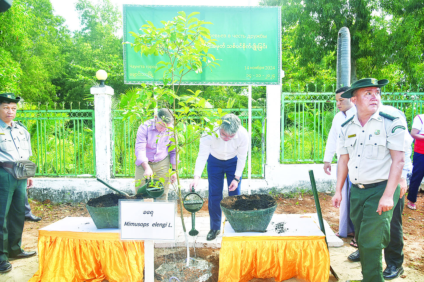 ပုသိမ်မြို့ ချောင်းသာကမ်းခြေ၌ ရောက်ရှိနေကြသည့် ရုရှားဖက်ဒရေးရှင်းနိုင်ငံ ဘူရားတီးရားပြည်နယ်အကြီးအကဲ H.E.Mr.Alexey Sambuevich Tsydenov ဦးဆောင်သော ကိုယ်စားလှယ်အဖွဲ့သည် ယနေ့ နံနက်ပိုင်းတွင် ချောင်းသာကမ်းခြေ၌ လှည့်လည်ကြည့်ရှုအနားယူအပန်းဖြေကြပြီး ချောင်းသာမြို့အဝင်၌ ရုရှား - မြန်မာ ချစ်ကြည်ရေးအထိမ်းအမှတ်အဖြစ် ခရေပင်ကို မြန်မာနိုင်ငံဆိုင်ရာ ရုရှားသံအမတ်ကြီး H.E.Mr.Iskander Azizov နှင့်အတူ စိုက်ပျိုးပေးကြသည်။