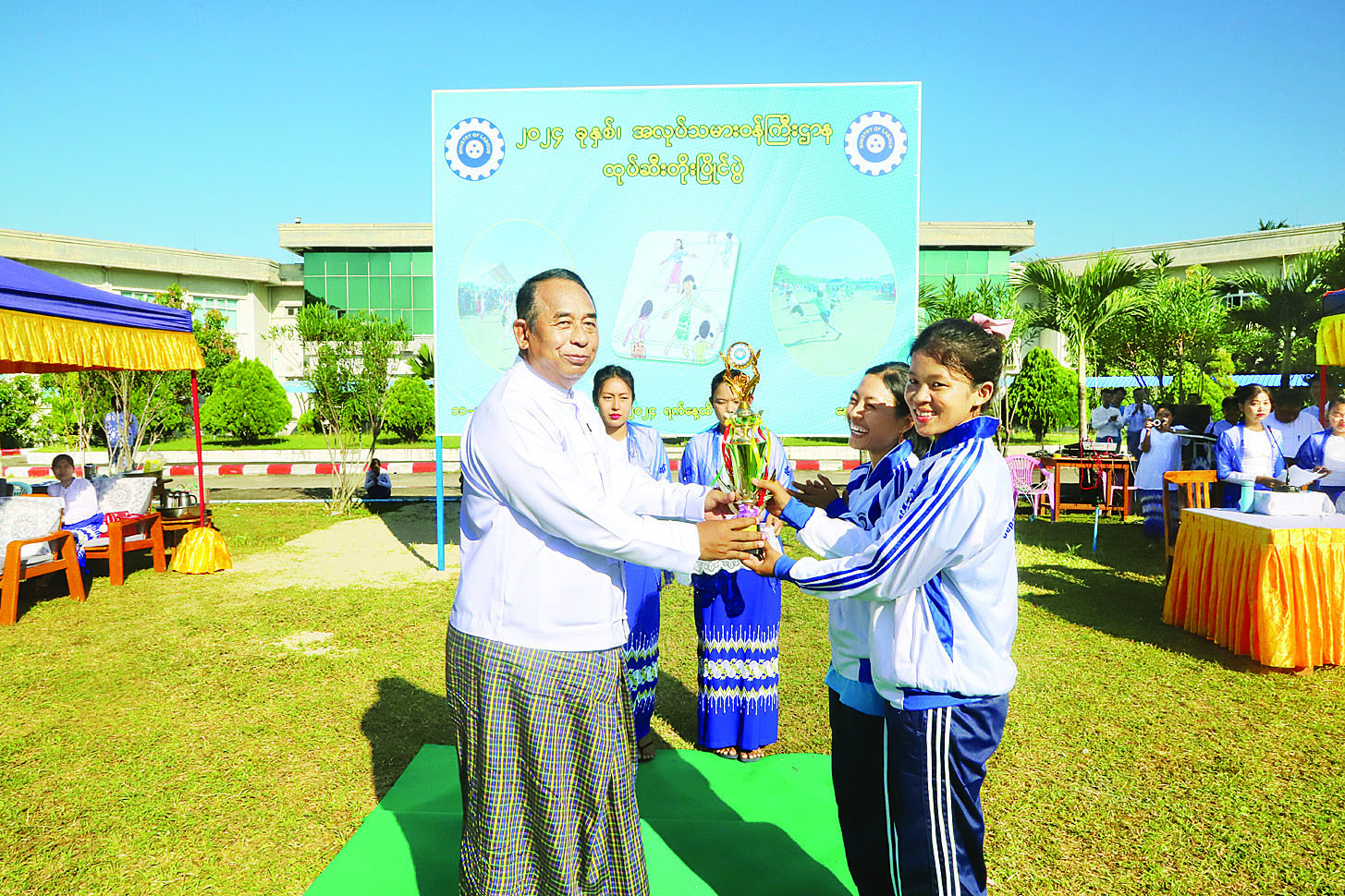 အလုပ်သမားဝန်ကြီးဌာန ထုပ်ဆီးတိုးပြိုင်ပွဲ ဆုချီးမြှင့်ခြင်းအခမ်းအနားကို ယနေ့နံနက်ပိုင်းတွင် ဝန်ကြီးရုံးရှေ့မြက်ခင်းပြင်၌ ကျင်းပရာ အလုပ်သမားဝန်ကြီးဌာန ပြည်ထောင်စုဝန်ကြီး ဦးမြင့်နောင်၊ အမြဲတမ်းအတွင်းဝန်နှင့် တာဝန်ရှိသူများ ပြိုင်ပွဲဝင်အသင်းများ၏ အုပ်ချုပ်သူများ၊ နည်းပြများ၊ အားကစားသမားများ၊ အားကစားနှင့်လူငယ်ရေးရာဝန်ကြီးဌာနမှ ဒိုင်အဖွဲ့ဝင်များ တက်ရောက်သည်။