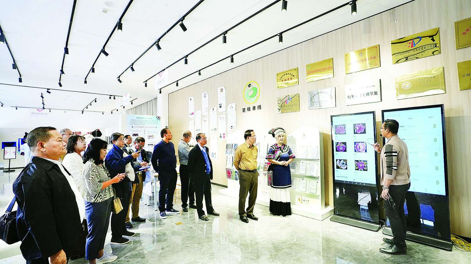 မွန်းလွဲပိုင်းတွင် ပြည်ထောင်စုဝန်ကြီးနှင့်အဖွဲ့သည် ချူရှုံ့မြို့ရှိ တရုတ်-ယွီ တိုင်းရင်းသားရိုးရာ ဒစ်ဂျစ်တယ်ချည်ထိုးလုပ်ငန်းစင်တာသို့ သွားရောက်ကြပြီး ၎င်းလုပ်ငန်းစုကို ၂၀၂၂ ခုနှစ်က အလုပ်ရုံ ၁၃ စုဖြင့်စတင်ခဲ့ရာမှ ယခုနှစ်တွင် အလုပ်ရုံပေါင်း ၅၀၀ ကျော်အထိ တိုးတက်လာသကဲ့သို့ ဝင်ငွေရရှိမှုလည်း တိုးတက်မြင့်မားလာရာ ယခုအခါ “နေအိမ်တိုင်းမှာ ချည်ထိုးငွေရှာ’’ အဆိုဖြစ်လာကြောင်း၊ ၎င်းတို့အား ရှန်ဟိုင်းမှ ကုမ္ပဏီကြီးများက အဓိက ကူညီမတည်ဖြည့်ဆည်းပေးပြီး စျေးကွက်မြှင်တင်ပေးခဲ့ရာ ၎င်းတို့ချည်ထိုးပုံစံနှင့် အဝတ်အထည် အမျိုးအစား၊ ဒီဇိုင်းတို့အား ရှန်ဟိုင်း၊ ပေကျင်းတို့မှတစ်ဆင့် ပဲရစ်၊ မီလန်ပြပွဲများအထိ ထိုးဖောက်နိုင်ပြီဖြစ်ကြောင်းသိရပြီး ဒီဇိုင်းပုံစံ၊ အဝတ်အထည်များ၊ မှတ်တမ်းဓာတ်ပုံများ၊ လက်တွေ့ ချည်ထိုးပြသခြင်းတို့ကို လှည့်လည်ကြည့်ရှုကြသည်။