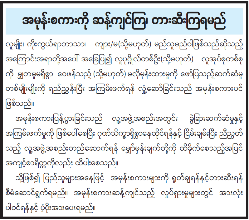 သို့ဖြစ်၍ ပြည်သူများအနေဖြင့် အမုန်းစကားများကို ရှုတ်ချရန်နှင့်တားဆီးရန် စီမံဆောင်ရွက်ရမည်။ အမုန်းစကားဆန့်ကျင်သည့် လှုပ်ရှားမှုများတွင် အားလုံးပါဝင်ရန်နှင့် ပံ့ပိုးအားပေးရမည်။