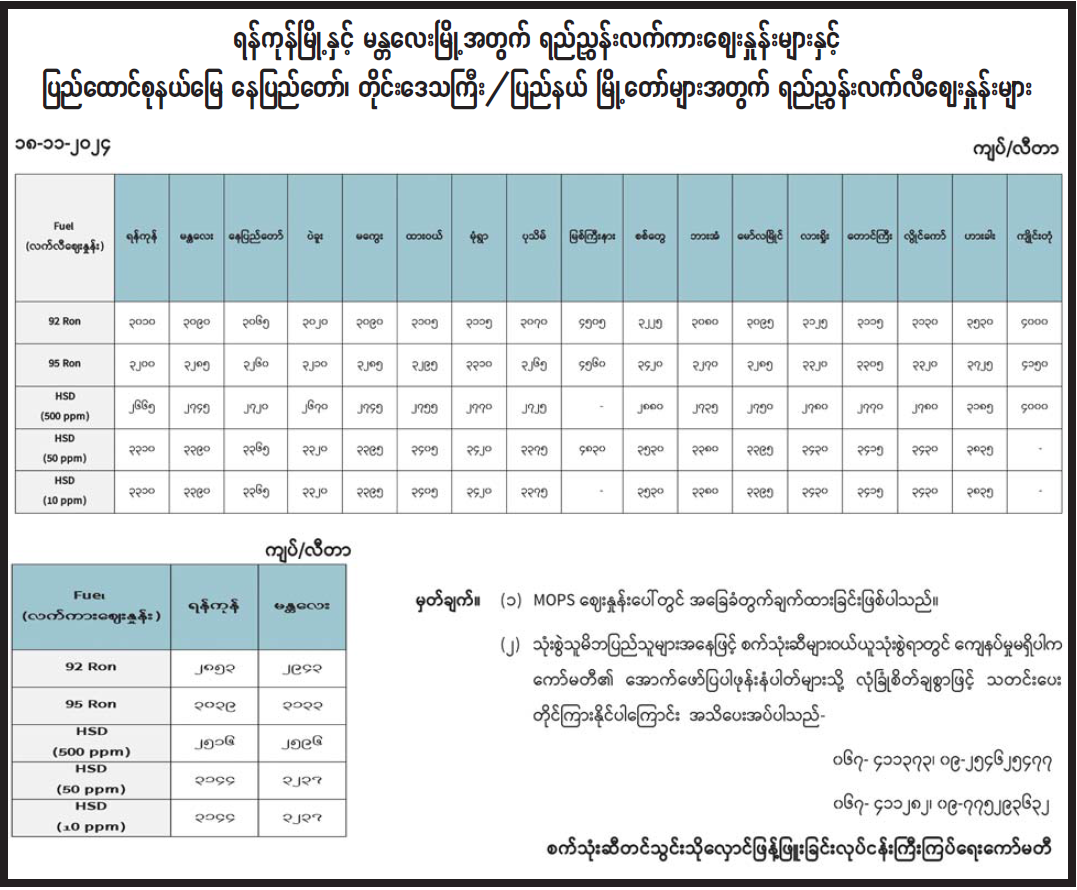 ရန်ကုန်မြို့နှင့် မန္တလေးမြို့အတွက် ရည်ညွှန်းလက်ကားဈေးနှုန်းများနှင့် ပြည်ထောင်စုနယ်မြေ နေပြည်တော်၊ တိုင်းဒေသကြီး/ပြည်နယ် မြို့တော်များအတွက် ရည်ညွှန်းလက်လီဈေးနှုန်းများ 11/18/2024