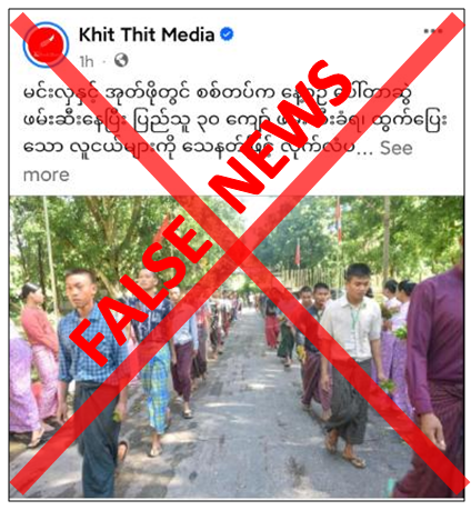 ပဲခူးတိုင်းဒေသကြီး၊ မင်းလှမြို့နယ်နှင့် အုတ်ဖိုမြို့နယ်တို့တွင် ပြည်သူ့စစ်မှုထမ်းဆောင်ရန် ပြည်သူ ၃၀ ကျော်ကို ပေါ်တာဆွဲဖမ်းဆီးခဲ့ကြောင်းနှင့် ထွက်ပြေးတိမ်းရှောင်သူများကို သေနတ်ဖြင့် လိုက်လံပစ်ခတ်ခဲ့ရာ ပြည်သူ ၁ ဦး ဒဏ်ရာရရှိခဲ့သည်ဟု သတင်းတု၊ သတင်းအမှားများကို တရားမဝင်ပြည်ဖျက်မီဒီယာများက မဟုတ်မမှန် လှုံ့ဆော်ရေးသားဝါဒဖြန့်ဝေနေသည်ကို တွေ့ရှိရသည်။