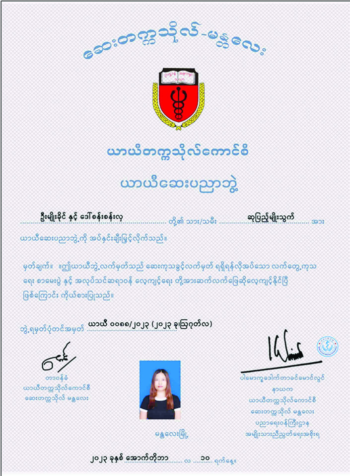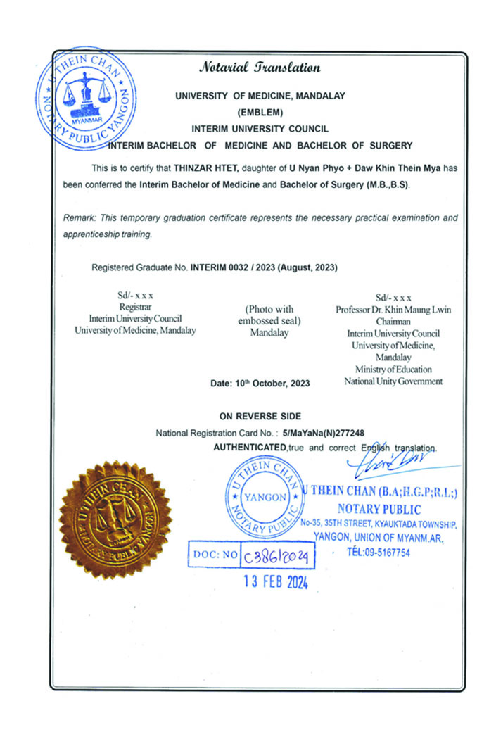 အဆိုပါ ယာယီဆေးပညာဘွဲ့လက်မှတ်အတုများအား ပြုလုပ်ပေးသူ ရန်ကုန်တိုင်းဒေသကြီး၊ ကျောက်တံတားမြို့နယ်၊ (၃၅)လမ်း၊ တိုက်အမှတ်(၃၅)၊ တတိယထပ်တွင် ရုံးခန်းဖွင့်လှစ်ထားသည့် သိဏ်းချမ်း(ခ)သိန်းဝင်း(B.A; H.G.P,R.L;) Notary Public မှ တရားမဝင် Notary (သက်သေခံချက်) ပြုလုပ်ပေးခဲ့ကြောင်း သိရှိရသည့်အတွက် နိုဝင်ဘာလ ၂၁ ရက်တွင် တရားမဝင် Notary (သက်သေခံချက်)ပြုလုပ်ပေးခဲ့သည့် ရန်ကုန်တိုင်းဒေသကြီး၊ ပန်းဘဲတန်းမြို့နယ်နေ တရားခံသိဏ်းချမ်း(ခ)သိန်းဝင်းနှင့် သင်္ဃန်းကျွန်းမြို့နယ်နေ တရားခံသက်ထက်ဦး(ခ)ဝင်းထက်မြတ်တို့ ၂ ဦးအား ၎င်းတို့ရုံးခန်း၌ စာရွက်စာတမ်းများ အတုပြုလုပ်ရာတွင် အသုံးပြုသည့် သက်သေခံ ပစ္စည်းများနှင့်အတူ ဖမ်းဆီးရမိခဲ့ပါသည်။