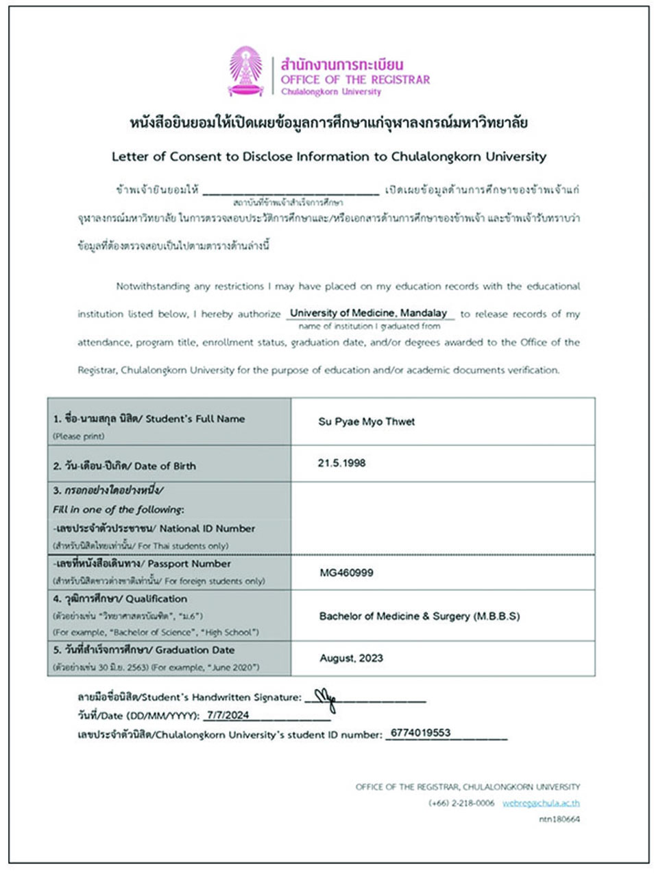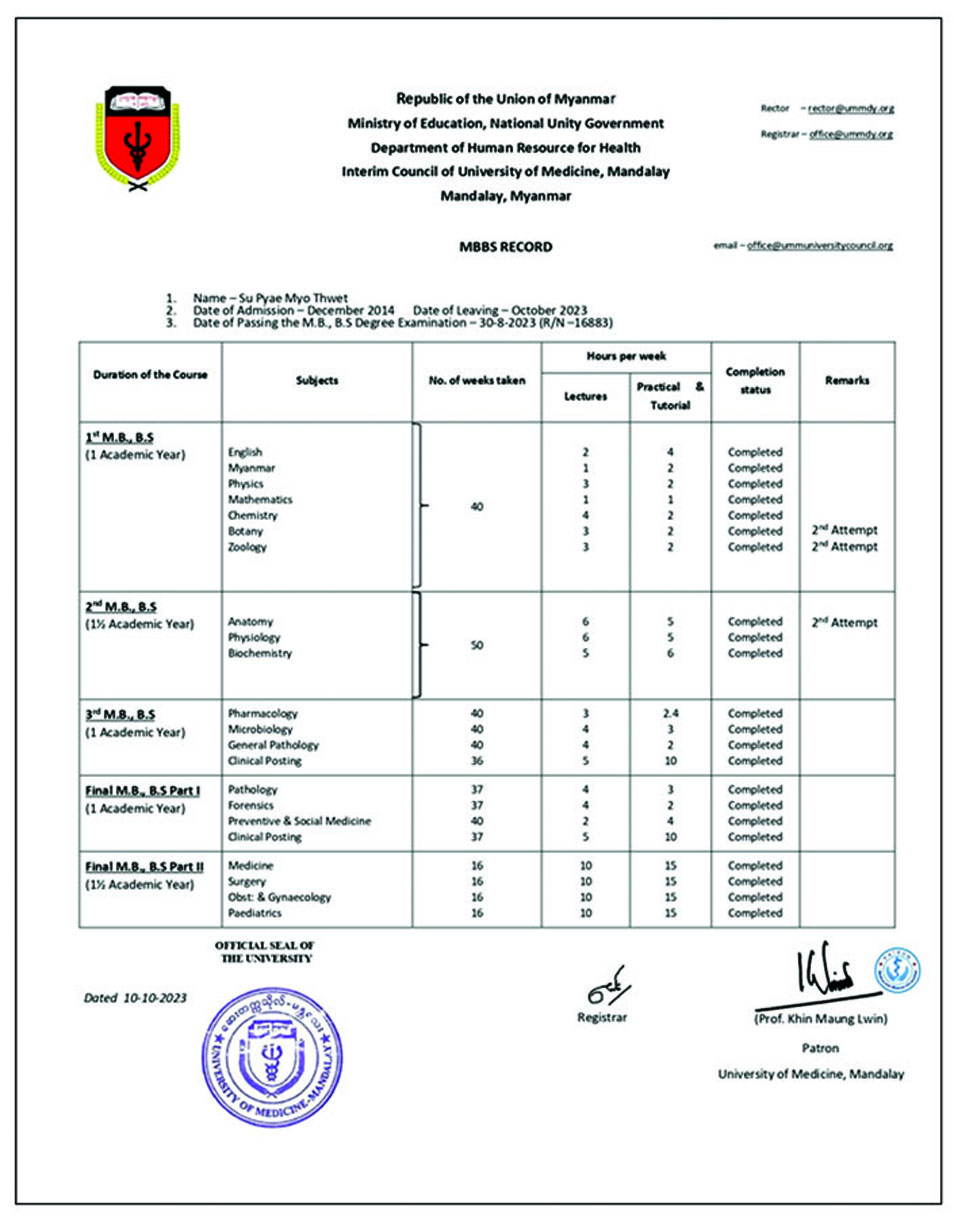 ၎င်းတို့ ၂ ဦးသည် အကြမ်းဖက်အုပ်စုအဖြစ်ကြေညာထားသော NUG အဖွဲ့ လက်အောက်ခံ တရားမဝင်ဆေးတက္ကသိုလ် (မန္တလေး)၊ ယာယီတက္ကသိုလ်ကောင်စီနာယက သစ္စာမဲ့ဝန်ထမ်း (Disloyalty Civil Servant-DCS) ဖြစ်သူခင်မောင်လွင် (ဆေးတက္ကသိုလ်-မန္တလေး၊ ပါမောက္ခချုပ်ဟောင်း)မှ တရားမဝင်ထုတ်ပေးခဲ့သည့် ယာယီဆေးပညာဘွဲ့လက်မှတ်အတုတို့ဖြင့် ထိုင်းနိုင်ငံ၊ Chulalongkom တက္ကသိုလ်သို့ တက်ရောက်ခွင့်ရရှိရေးအတွက် တရားမဝင်လျှောက်ထားခဲ့ကြောင်းသိရှိရသည်။ ၂၀၂၄ ခုနှစ်၊ နိုဝင်ဘာလ ၁၉ ရက်တွင် ထိုင်းနိုင်ငံ၊ Chulalongkorn တက္ကသိုလ်မှ အဆိုပါကျောင်းသူ ၂ ဦး၏ တက္ကသိုလ်တက်ရောက်ခွင့် လျှောက်ထားမှုနှင့်ပတ်သက်၍ သံသယရှိသဖြင့် ယာယီဆေးပညာဘွဲ့လက်မှတ်များအား အတည်ပြုပေးနိုင်ရန် မြန်မာနိုင်ငံရှိဆေးတက္ကသိုလ် (မန္တလေး)သို့ အကြောင်းကြားလာခဲ့ကြောင်း သိရှိရသည်။