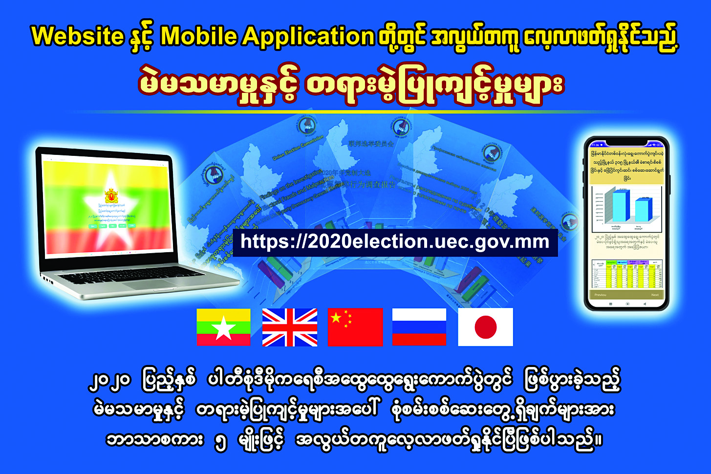ထို့အပြင် မြန်မာ၊ အင်္ဂလိပ်၊ တရုတ်၊ ရုရှား၊ ဂျပန် စသည့် ဘာသာစကားငါးမျိုးဖြင့် လွှင့်တင်မည်ဖြစ်ရာ လေ့လာဖတ်ရှုလိုသူများသည် https://2020election.uec.gov.mm တွင်လည်းကောင်း၊ Mobile Application ကို အဆိုပါ Website တွင် Download ရယူ၍လည်းကောင်း လေ့လာဖတ်ရှုနိုင်ပြီဖြစ်ကြောင်း သိရသည်။