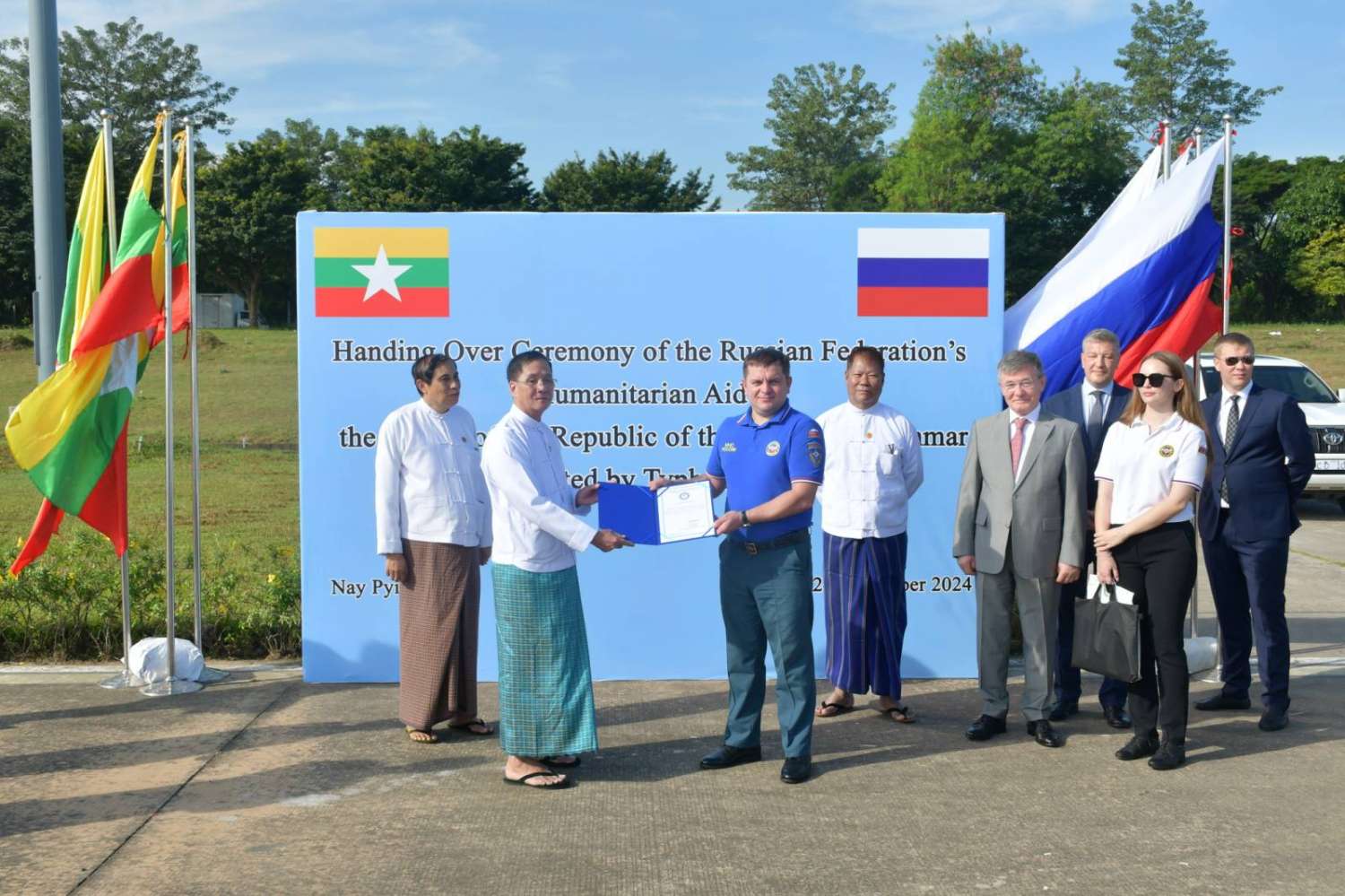 တိုင်ဖွန်းရာဂီ၏ သက်ရောက်မှုကြောင့် ရေဘေးသင့်ဒေသများ ပြန်လည်ထူထောင်ရေးအတွက် ရုရှားဖက်ဒရေးရှင်းနိုင်ငံဝန်ကြီးဌာနများနှင့် ကုမ္ပဏီများမှ လူသားချင်းစာနာထောက်ထားမှု အကူအညီပစ္စည်းများ စုစုပေါင်းတန်ချိန် (၃၅) တန်ခန့်ပါဝင်ပြီး ရေဘေးသင့်ဒေသများသို့ အမြန်ဆုံးခွဲဝေပို့ဆောင်သွားမည်ဖြစ်ကြောင်း သတင်းရရှိပါသည်။