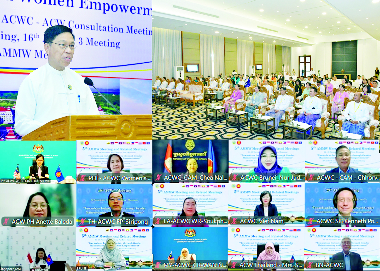 အာဆီယံအတွင်းရေးမှူးချုပ်ရုံးက ကြီးမှူး၍ မြန်မာနိုင်ငံက အိမ်ရှင်အဖြစ် ကျင်းပသော ပဉ္စမအကြိမ်မြောက် အာဆီယံအမျိုးသမီးရေးရာဝန်ကြီးအဆင့်အစည်းအဝေးနှင့် ဆက်စပ်အစည်းအဝေးများ (5th ASEAN Ministerial Meeting on Women – 5th AMMW and Related Meetings)၏ ဖွင့်ပွဲအခမ်းအနားကို ယနေ့နံနက် ၉ နာရီတွင် နေပြည်တော် M.Gallery ဟိုတယ်၌ ကျင်းပသည်။