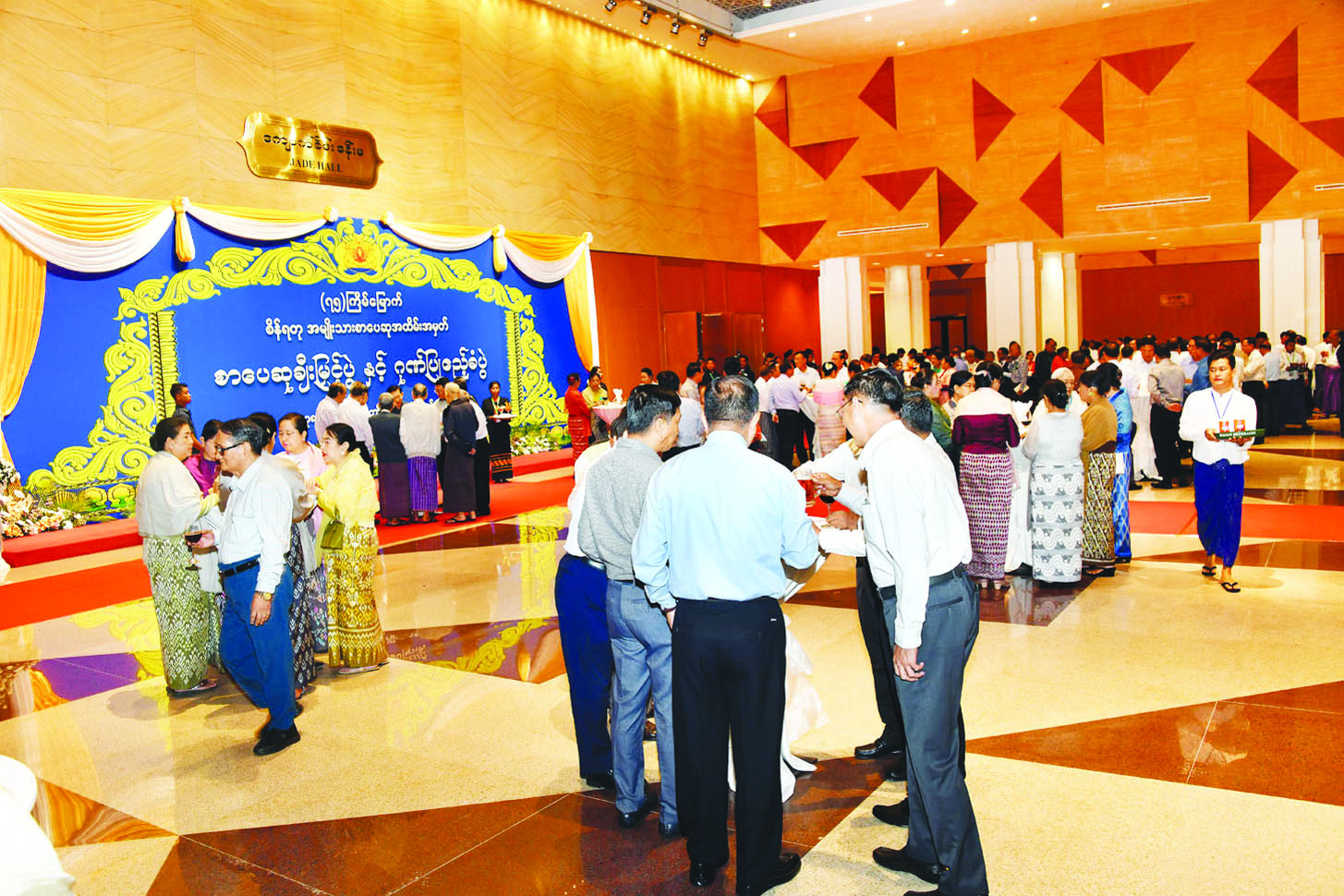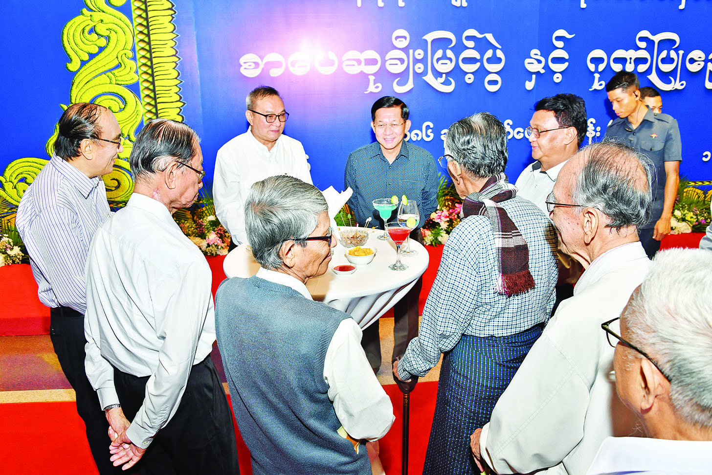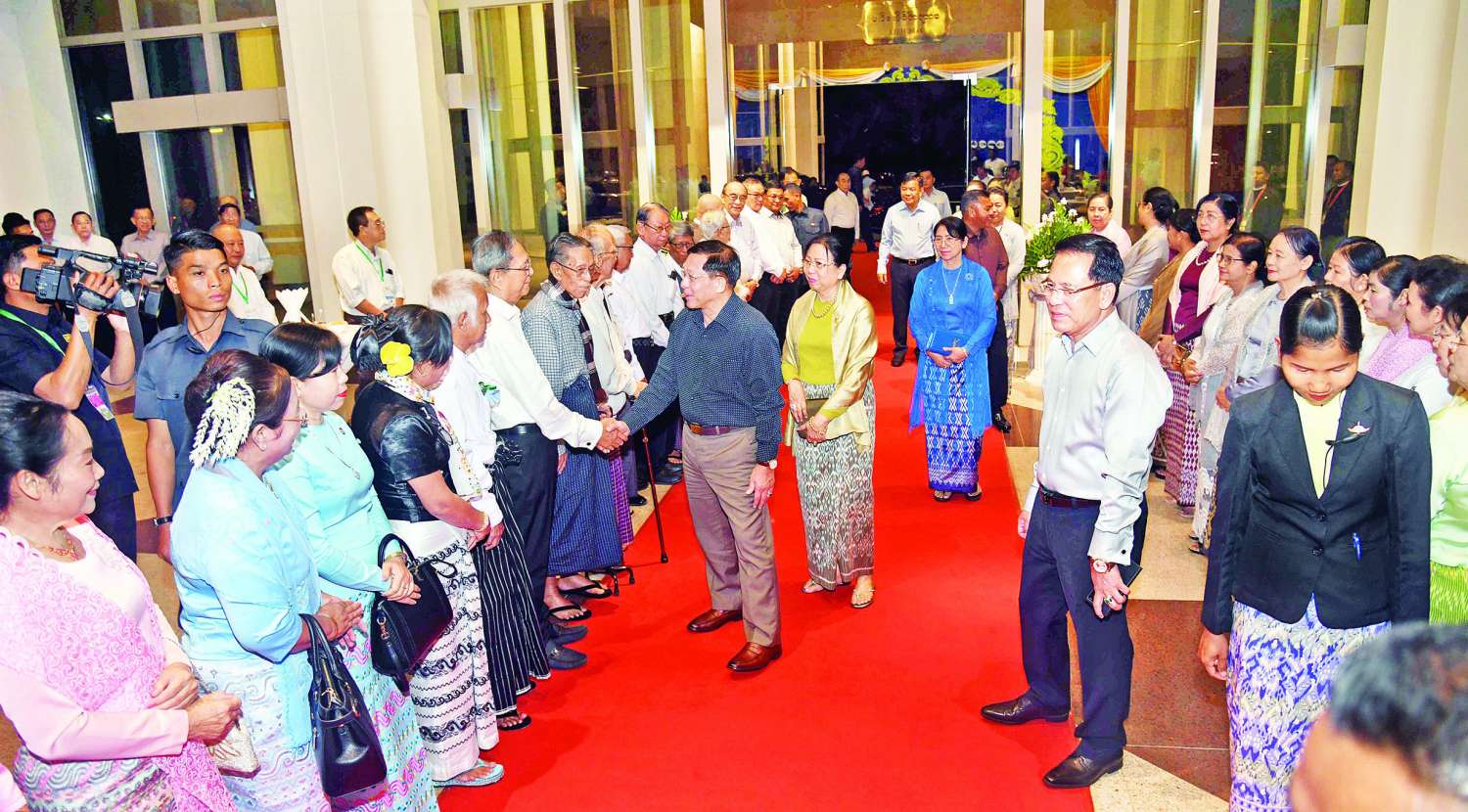ဦးစွာ နိုင်ငံတော်စီမံအုပ်ချုပ်ရေးကောင်စီဥက္ကဋ္ဌ နိုင်ငံတော်ဝန်ကြီးချုပ်နှင့် ဇနီးတို့အား အခမ်းအနားတက်ရောက်လာကြသူများက ကြိုဆိုနှုတ်ဆက်ကြသည်။