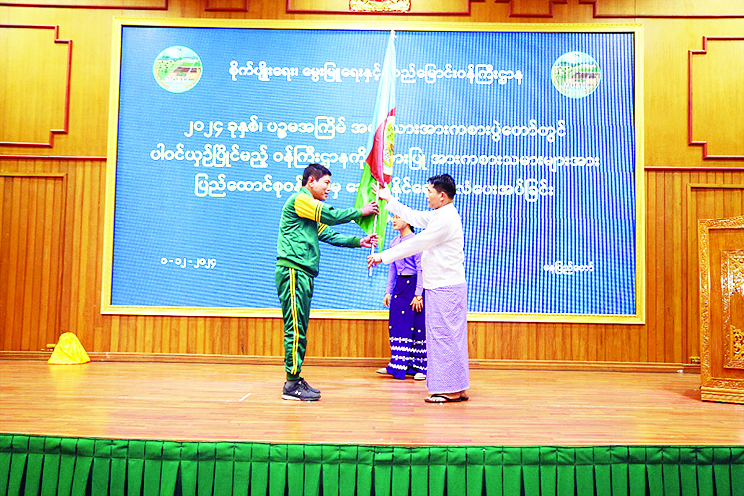 ပဉ္စမအကြိမ် အမျိုးသားအားကစားပွဲတော်တွင် ပါဝင်ယှဉ်ပြိုင်မည့် ဝန်ကြီးဌာန အားကစားအဖွဲ့များထံသို့ အောင်နိုင်ရေးအလံပေးအပ်ပွဲအခမ်းအနားကို ယနေ့ မွန်းလွဲပိုင်းက စိုက်ပျိုးရေး၊ မွေးမြူရေးနှင့်ဆည်မြောင်းဝန်ကြီးဌာန စုဝေးဆောင်ခန်းမ၌ ကျင်းပရာ ပြည်ထောင်စုဝန်ကြီး ဦးမင်းနောင်၊ ဒုတိယဝန်ကြီးများနှင့် ဌာနဆိုင်ရာတာဝန်ရှိသူများ၊ အားကစားအသင်းခေါင်းဆောင်များနှင့် အားကစားမောင်မယ်များ တက်ရောက်ကြသည်။