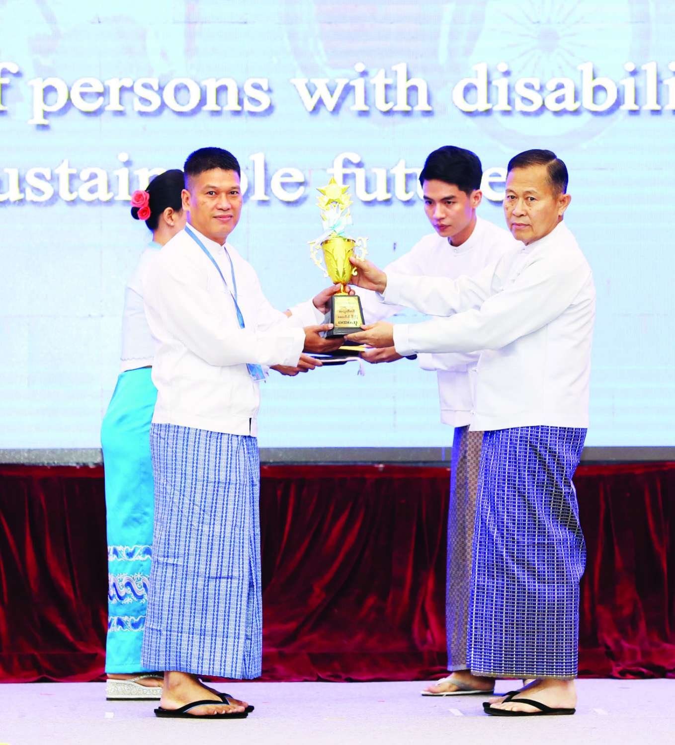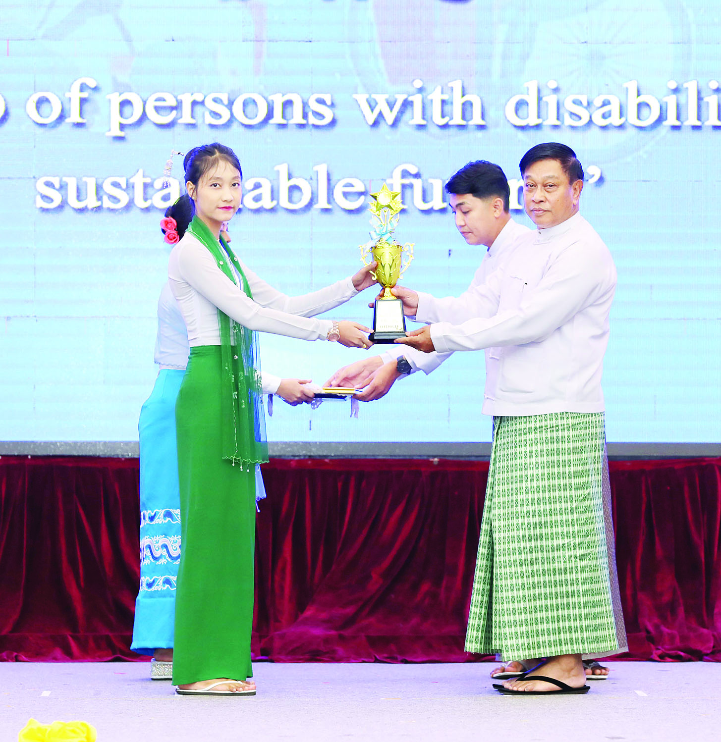 ထို့နောက် နိုင်ငံတော်စီမံအုပ်ချုပ်ရေးကောင်စီအဖွဲ့ဝင် ဗိုလ်ချုပ်ကြီး တင်အောင်စန်းက အခြေခံပညာအထက်တန်းအဆင့် စာစီစာကုံးပြိုင်ပွဲတွင် ဆုရရှိကြသူများကိုလည်းကောင်း၊ နိုင်ငံတော်စီမံအုပ်ချုပ်ရေးကောင်စီအဖွဲ့ဝင် ဒုတိယဗိုလ်ချုပ်ကြီး ရာပြည့်က မသန်စွမ်းသူများအတွက် အတားအဆီးမဲ့ ခရီးသွားလာရေးဂုဏ်ပြုဆု ရရှိကြသူများကိုလည်းကောင်း၊ မသန်စွမ်းသူများ၏ အခွင့်အရေးများဆိုင်ရာ အမျိုးသားကော်မတီဒုတိယဥက္ကဋ္ဌ (၁) ပြည်ထောင်စုဝန်ကြီး ဒေါက်တာစိုးဝင်းက အလုပ်အကိုင်အခွင့်အလမ်းဂုဏ်ပြုဆုနှင့် စာစီစာကုံးပြိုင်ပွဲများတွင် ပါဝင်ယှဉ်ပြိုင်ခဲ့ကြသည့် ကျောင်းသား၊ ကျောင်းသူများကိုလည်းကောင်း ဂုဏ်ပြုဆုနှင့် ဂုဏ်ပြုမှတ်တမ်းလွှာများ ပေးအပ်ကြသည်။