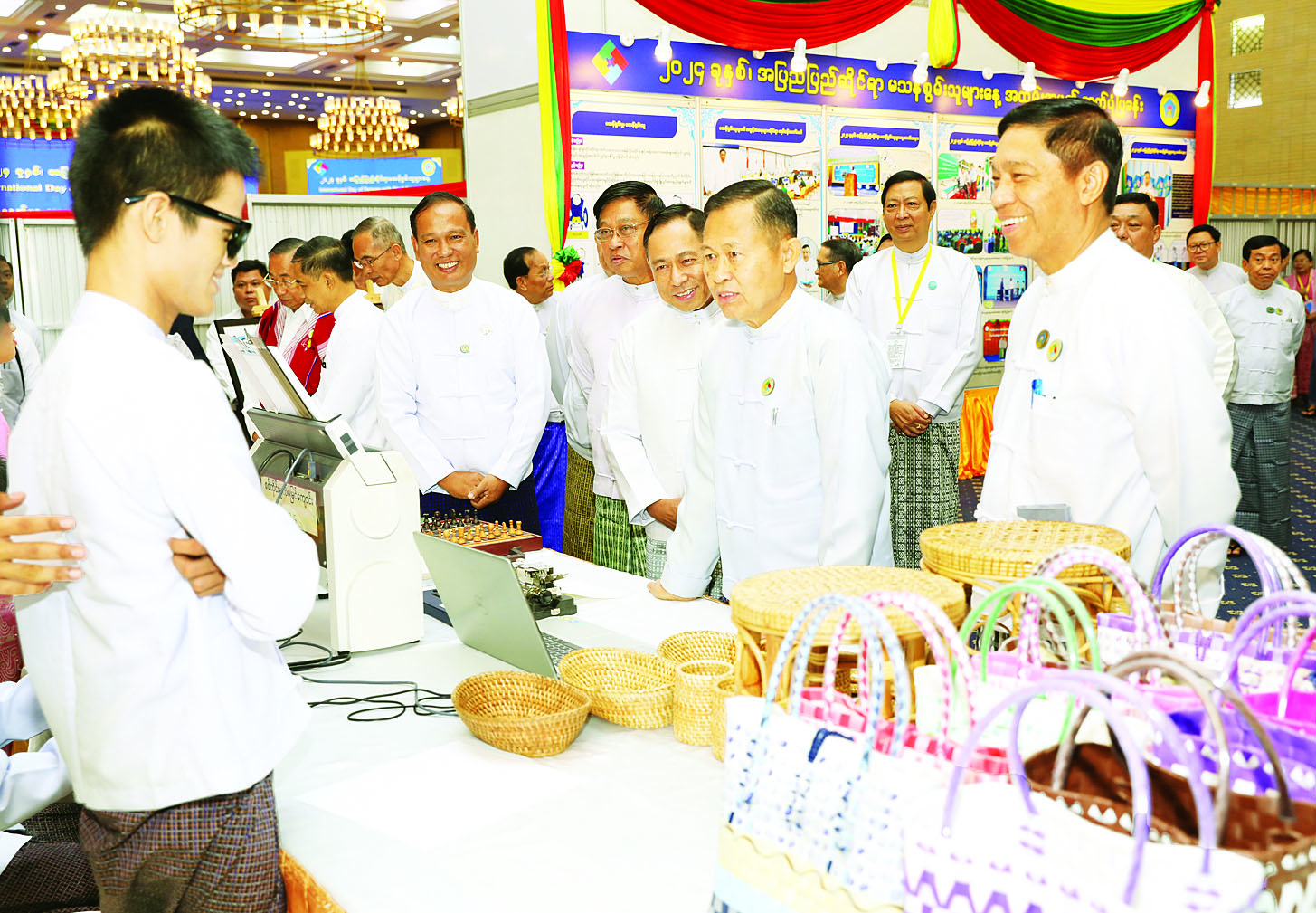 ယင်းနောက် မသန်စွမ်းသူများ၏ အခွင့်အရေးများဆိုင်ရာ အမျိုးသားကော်မတီဥက္ကဋ္ဌ နိုင်ငံတော်စီမံအုပ်ချုပ်ရေးကောင်စီ ဒုတိယဥက္ကဋ္ဌ ဒုတိယဝန်ကြီးချုပ် ဒုတိယဗိုလ်ချုပ်မှူးကြီး စိုးဝင်းသည် အခမ်းအနားသို့ တက်ရောက်လာကြသူများနှင့်အတူ စုပေါင်းမှတ်တမ်းတင်ဓာတ်ပုံရိုက်ကြပြီး ခင်းကျင်းပြသထားသည့် မသန်စွမ်းသူများနှင့် သက်ဆိုင်သော စာအုပ်များ၊ လက်မှုထုတ်ကုန်ပစ္စည်းများနှင့် အထိမ်းအမှတ် ဓာတ်ပုံပြခန်းများကို ကြည့်ရှုခဲ့ကြောင်း သတင်းရရှိသည်။