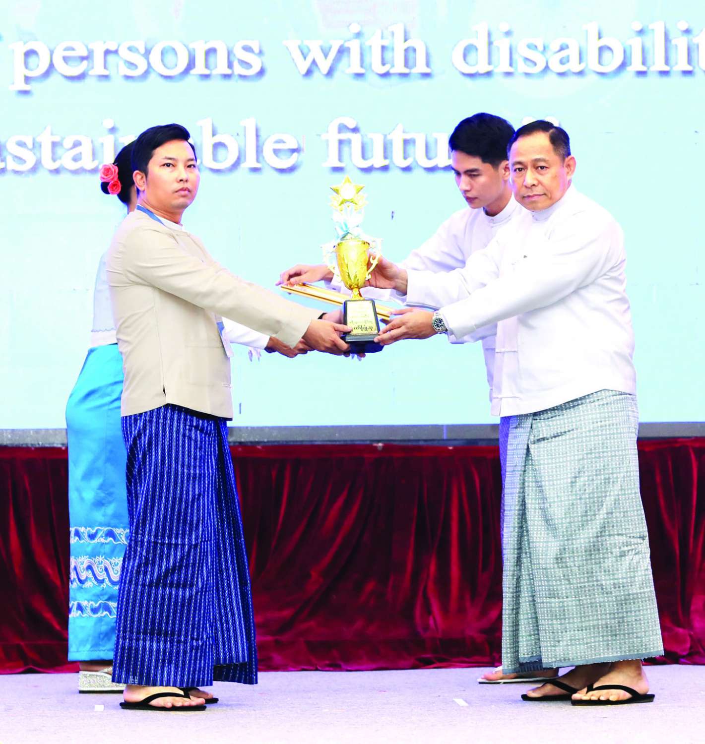 ထို့နောက် မသန်စွမ်းသူများ၏ အခွင့်အရေးများဆိုင်ရာ အမျိုးသားကော်မတီဥက္ကဋ္ဌ နိုင်ငံတော်စီမံအုပ်ချုပ်ရေးကောင်စီ ဒုတိယဥက္ကဋ္ဌ ဒုတိယဝန်ကြီးချုပ် ဒုတိယဗိုလ်ချုပ်မှူးကြီး စိုးဝင်းက အပြည်ပြည်ဆိုင်ရာ မသန်စွမ်းသူများနေ့အထိမ်းအမှတ် အလွတ်တန်းဆောင်းပါးပြိုင်ပွဲတွင် ပထမ၊ ဒုတိယ၊ တတိယဆု ရရှိကြသူများကို ဂုဏ်ပြုဆုတံဆိပ်၊ ဂုဏ်ပြုမှတ်တမ်းလွှာနှင့် ဂုဏ်ပြုဆုငွေများ ပေးအပ်ချီးမြှင့်သည်။