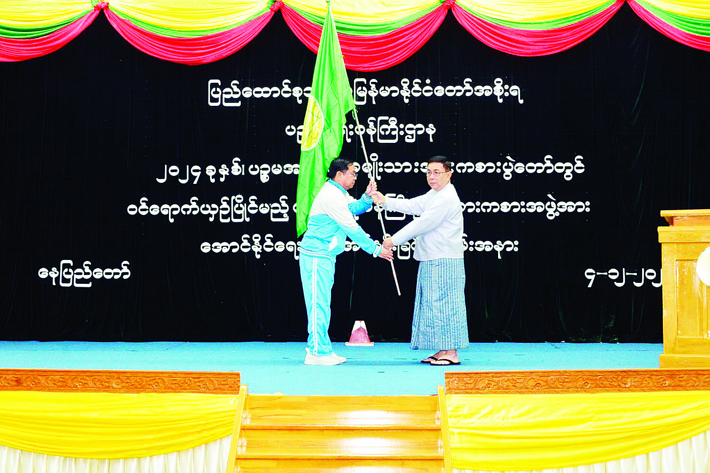 ၂၀၂၄ ခုနှစ် ပဉ္စမအကြိမ် အမျိုးသားအားကစားပွဲတော်သို့ ဝင်ရောက်ယှဉ်ပြိုင်မည့် ပညာရေးဝန်ကြီးဌာန အားကစားအဖွဲ့အား အောင်နိုင်ရေးအလံအပ်နှင်းခြင်းအခမ်းအနားကို ယနေ့နံနက် ၉ နာရီခွဲတွင် နေပြည်တော် ပညာရေးဝန်ကြီးဌာန ရုံးအမှတ်(၁၃)ရှိ အစည်းအဝေးခန်းမ၌ ကျင်းပရာ ပညာရေးဝန်ကြီးဌာန ပြည်ထောင်စုဝန်ကြီး ဒေါက်တာညွန့်ဖေ၊ ဒုတိယဝန်ကြီး ဒေါက်တာဇော်မြင့်နှင့် ဒေါက်တာမိုးဇော်ထွန်း၊ တာဝန်ရှိသူများ၊ ပညာရေးဝန်ကြီးဌာန ကိုယ်စားပြုအားကစားအဖွဲ့များမှ အုပ်ချုပ်သူများ၊ နည်းပြများ၊ အားကစားသမားများနှင့် တာဝန်ရှိသူများ တက်ရောက်ကြသည်။