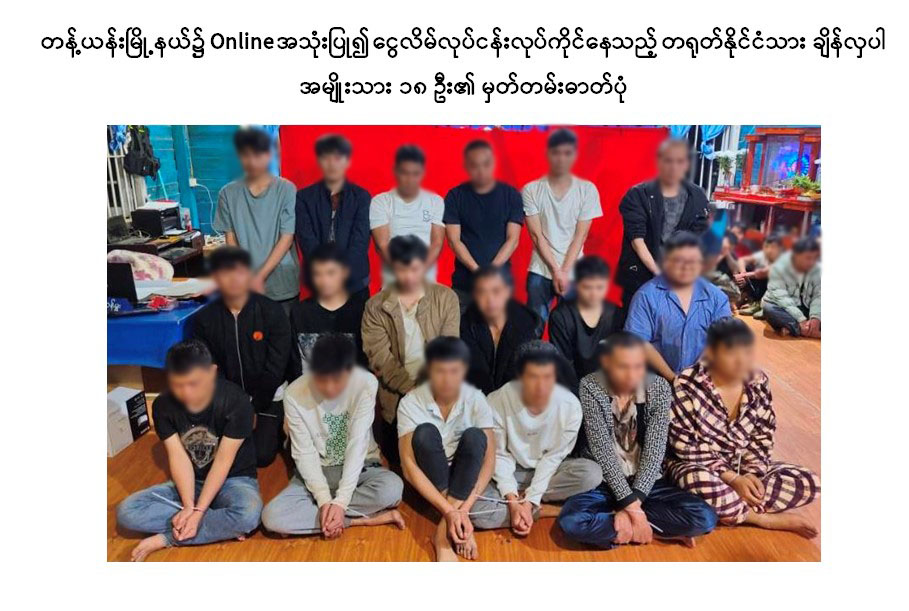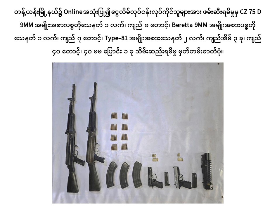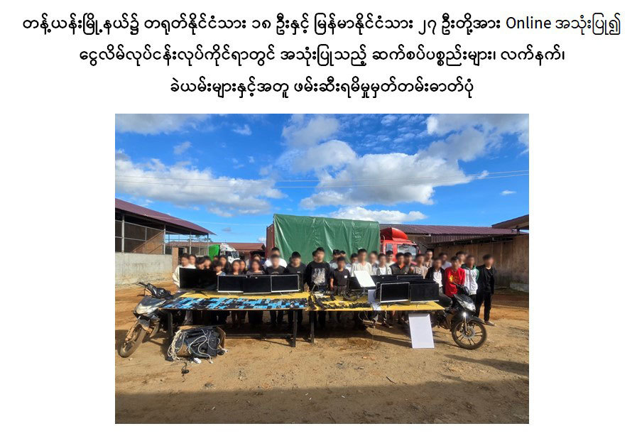 ရှမ်းပြည်နယ်(မြောက်ပိုင်း)၊ တန့်ယန်းမြို့နယ်၌ Online အသုံးပြု၍ ငွေလိမ်လုပ်ငန်းလုပ်ကိုင်နေသူ တရုတ်နိုင်ငံသား ၁၈ ဦးနှင့် မြန်မာနိုင်ငံသား ၂၇ ဦးတို့အား ငွေလိမ်လုပ်ငန်းလုပ်ကိုင်ရာတွင် အသုံးပြုသည့် ဆက်စပ်ပစ္စည်းများ၊ လက်နက်၊ ခဲယမ်းများနှင့်အတူ ဖမ်းဆီးရမိ