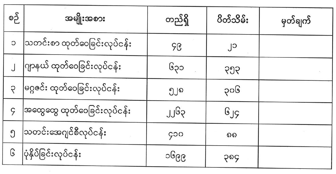 ပုံနှိပ်ခြင်းလုပ်ငန်း၊ ထုတ်ဝေခြင်းလုပ်ငန်း(သတင်းစာ၊ ဂျာနယ်၊ မဂ္ဂဇင်း၊ အထွေထွေ) သတင်းအေဂျင်စီလုပ်ငန်းများ ခွင့်ပြုထားရှိမှုနှင့် ထုတ်ဝေမှုအခြေအနေ (၃၀-၁၁-၂၀၂၄) 12/06/2024