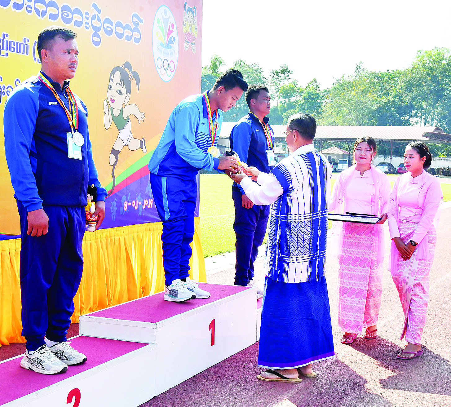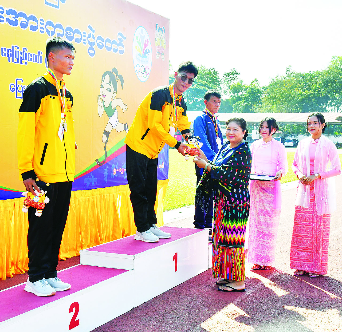 ထို့နောက် နိုင်ငံတော်စီမံအုပ်ချုပ်ရေးကောင်စီအဖွဲ့ဝင် ပိုးရယ်အောင်သိန်းက အမျိုးသမီးအလျားခုန် T44/64 ပြိုင်ပွဲတွင် ပထမဆုရရှိသည့် ဧရာဝတီတိုင်းဒေသကြီး၊ ဒုတိယဆုရရှိသည့် မွန်ပြည်နယ်နှင့် တတိယဆုရရှိသည့် ဧရာဝတီတိုင်းဒေသကြီးတို့မှ ပြိုင်ပွဲဝင်များကိုလည်းကောင်း၊ နိုင်ငံတော်စီမံအုပ်ချုပ်ရေးကောင်စီအဖွဲ့ဝင် မန်းငြိမ်းမောင်က အမျိုးသားသံပြားပစ် F64 ပြိုင်ပွဲတွင် ပထမဆုရရှိသည့် ပဲခူးတိုင်းဒေသကြီး၊ ဒုတိယဆုနှင့် တတိယဆုရရှိသည့် မန္တလေးတိုင်းဒေသကြီးတို့မှ ပြိုင်ပွဲဝင်များကိုလည်းကောင်း၊ နိုင်ငံတော်စီမံအုပ်ချုပ်ရေးကောင်စီအဖွဲ့ဝင် ဒေါ်ဒွဲဘူက အမျိုးသားလှံတံပစ် F46 ပြိုင်ပွဲတွင် ပထမဆုနှင့် ဒုတိယဆုရရှိသည့် မွန်ပြည်နယ်နှင့် တတိယဆုရရှိသည့် မန္တလေးတိုင်းဒေသကြီးတို့မှ ပြိုင်ပွဲဝင်များကိုလည်းကောင်း ဂုဏ်ပြုဆုတံဆိပ်နှင့် အမျိုးသားအားကစားပွဲတော်အထိမ်းအမှတ်အရုပ်ကို ပေးအပ်ချီးမြှင့်ကြသည်။