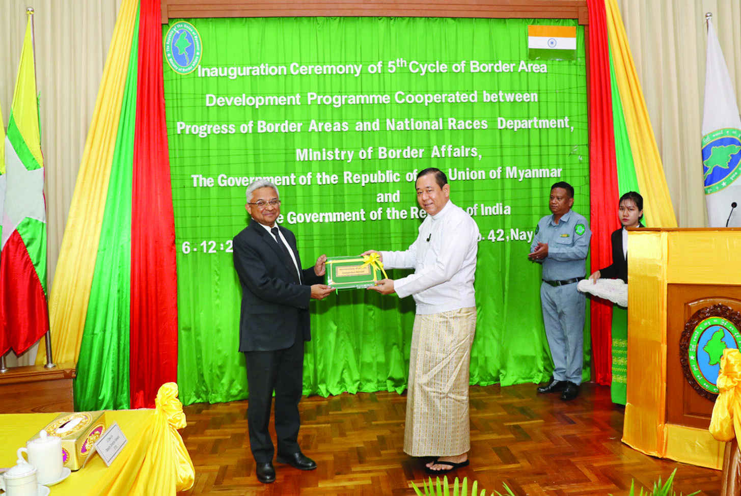 နယ်စပ်ရေးရာဝန်ကြီးဌာန နယ်စပ်ဒေသနှင့် တိုင်းရင်းသားလူမျိုးများဖွံ့ဖြိုးတိုးတက်ရေးဦးစီးဌာနနှင့် အိန္ဒိယသမ္မတနိုင်ငံတို့အကြား ပူးပေါင်းဆောင်ရွက်ခဲ့သည့် စီမံကိန်းလုပ်ငန်းများပြီးစီးမှု အထိမ်းအမှတ်အခမ်းအနားကို ယနေ့နံနက်ပိုင်းတွင် နယ်စပ်ရေးရာဝန်ကြီးဌာန ဝန်ကြီးရုံးအစည်းအဝေးခန်းမ၌ ကျင်းပသည်။