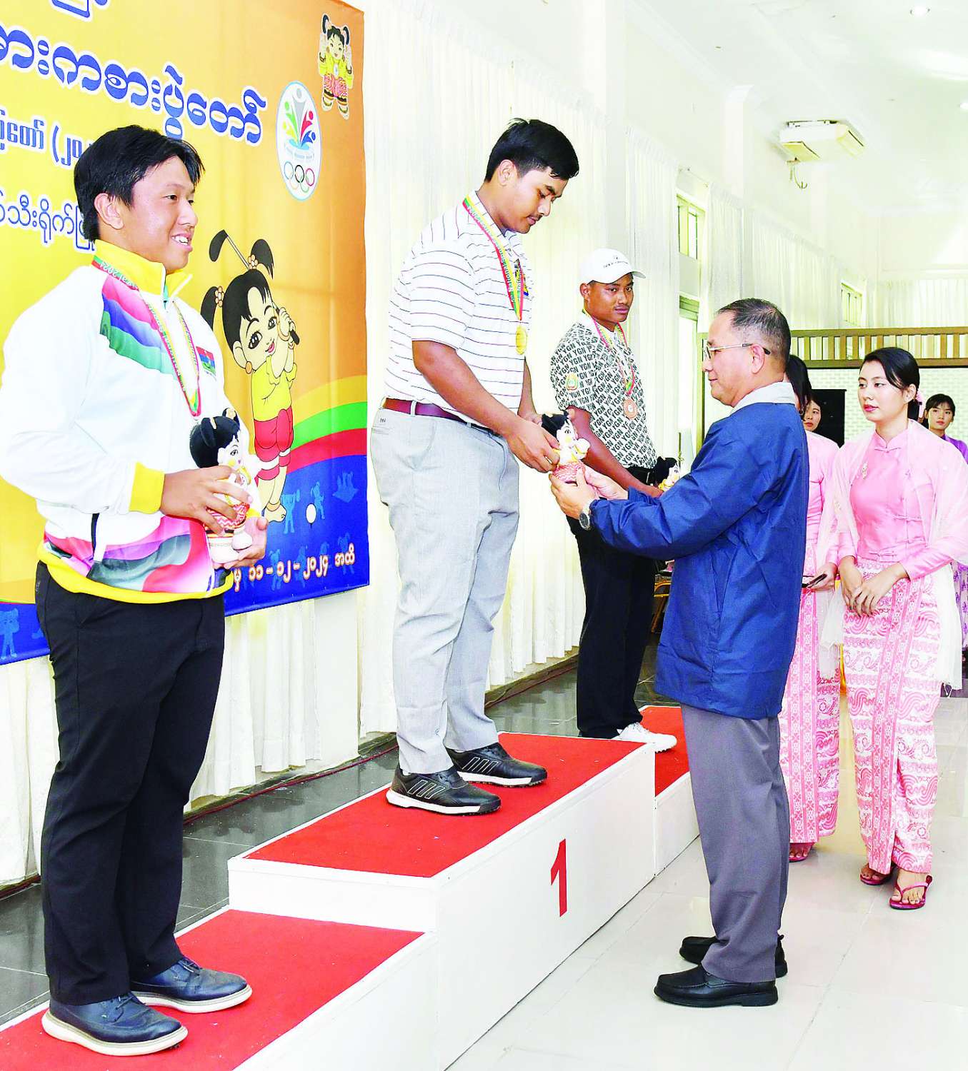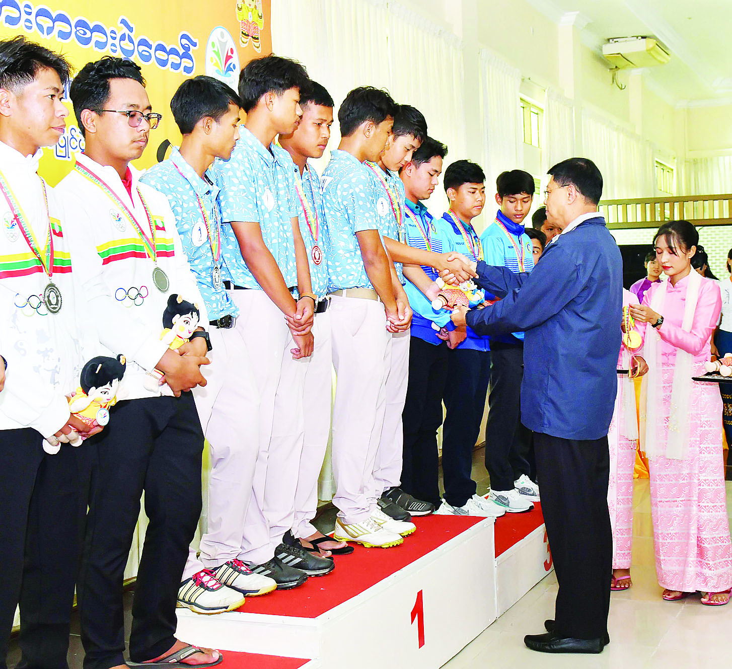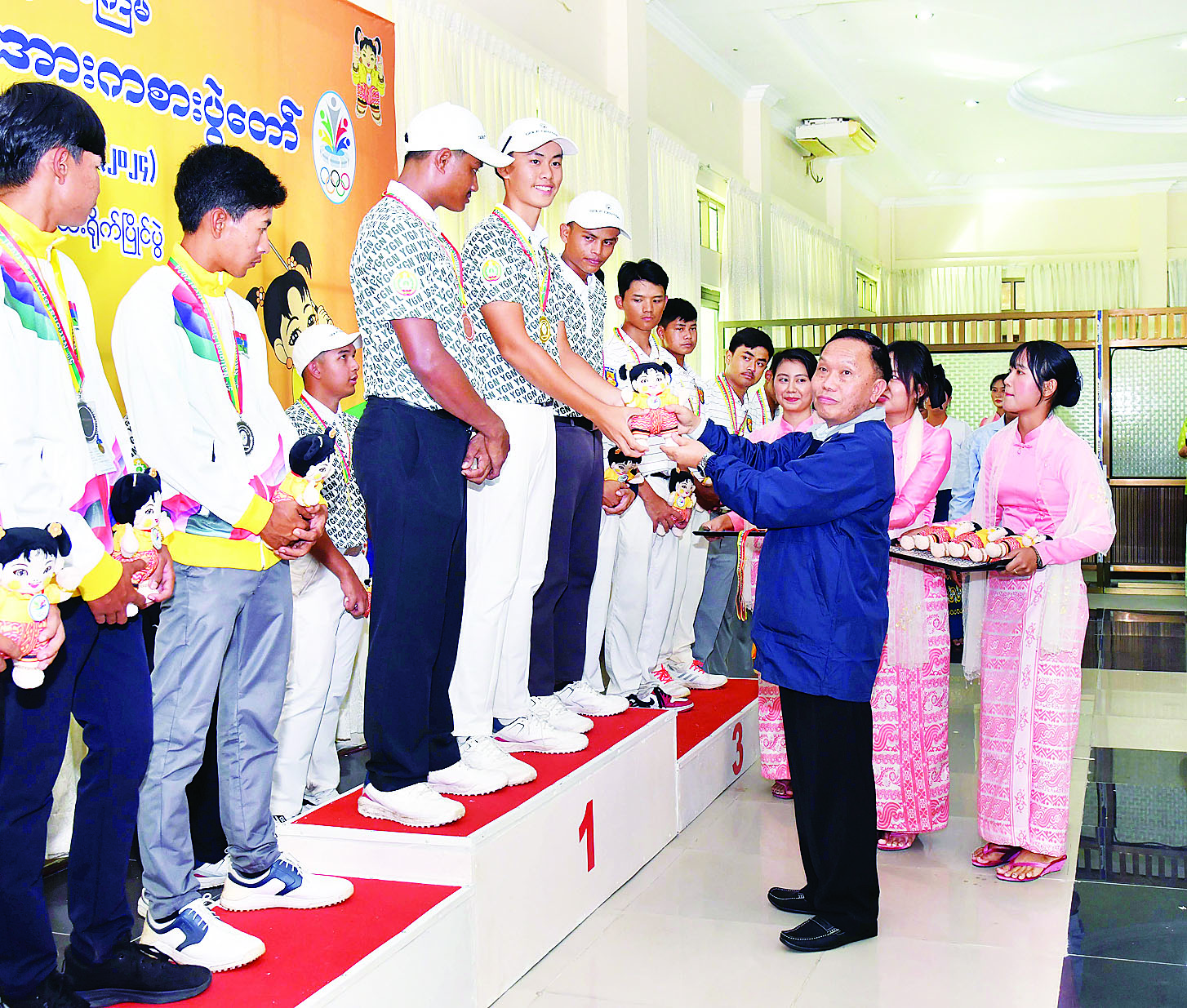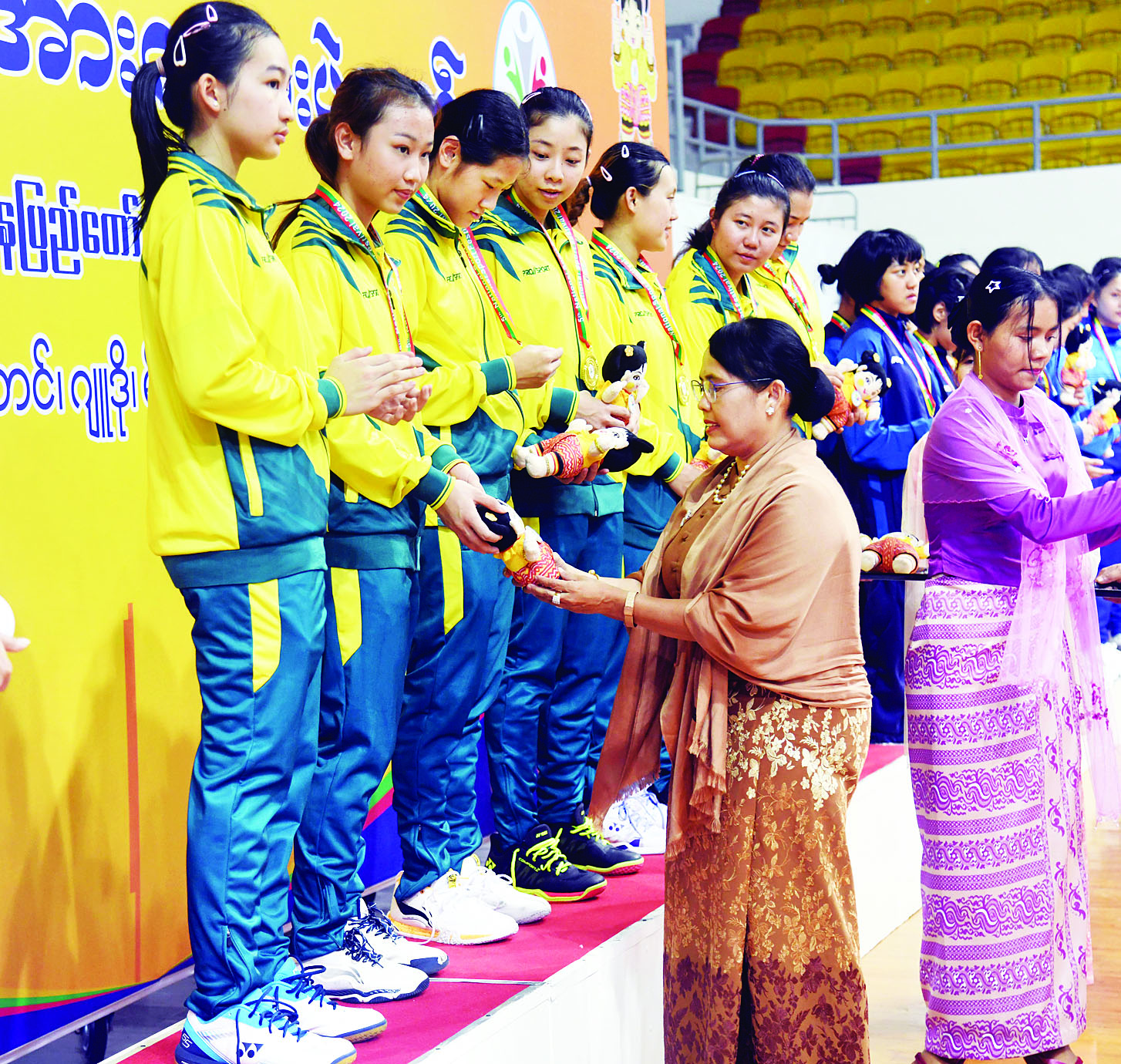 ပြည်နယ်နှင့် တိုင်းဒေသကြီး ကြက်တောင်ရိုက်ပြိုင်ပွဲ ဆုချီးမြှင့်ပွဲအခမ်းအနားကို ဝဏ္ဏသိဒ္ဓိအားကစားကွင်း (C) ရုံ၌ကျင်းပရာ ပဲခူးတိုင်းဒေသကြီးအစိုးရအဖွဲ့ လူမှုရေးရာဝန်ကြီး ဦးမျိုးအောင်နှင့် ရှမ်းပြည်နယ်အစိုးရအဖွဲ့ လူမှုရေးရာဝန်ကြီး ဦးမင်းမင်းလွင်တို့က အမျိုးသမီး အသင်းလိုက်ပြိုင်ပွဲတွင် ပူးတွဲတတိယဆုရရှိကြသည့် မန္တလေးတိုင်းဒေသကြီးနှင့် ပဲခူးတိုင်းဒေသကြီးအသင်းတို့မှ ပြိုင်ပွဲဝင်များကိုလည်းကောင်း၊ ဒုတိယဝန်ကြီး ဦးထိန်လင်းက ဒုတိယဆုရရှိသည့် ရှမ်းပြည်နယ်အသင်းမှ ပြိုင်ပွဲဝင်များကိုလည်းကောင်း၊ ပြည်ထောင်စုဝန်ကြီးနှင့် ပြည်ထောင်စုရှေ့နေချုပ် ဒေါက်တာသီတာဦးက ပထမဆုရရှိသည့် ရန်ကုန်တိုင်းဒေသကြီးအသင်းမှ ပြိုင်ပွဲဝင်များကိုလည်းကောင်း တစ်ဦးချင်းဂုဏ်ပြုဆု တံဆိပ်နှင့် အမျိုးသားအားကစားပွဲတော် အထိမ်းအမှတ်အရုပ်အား ပေးအပ်ချီးမြှင့်သည်။