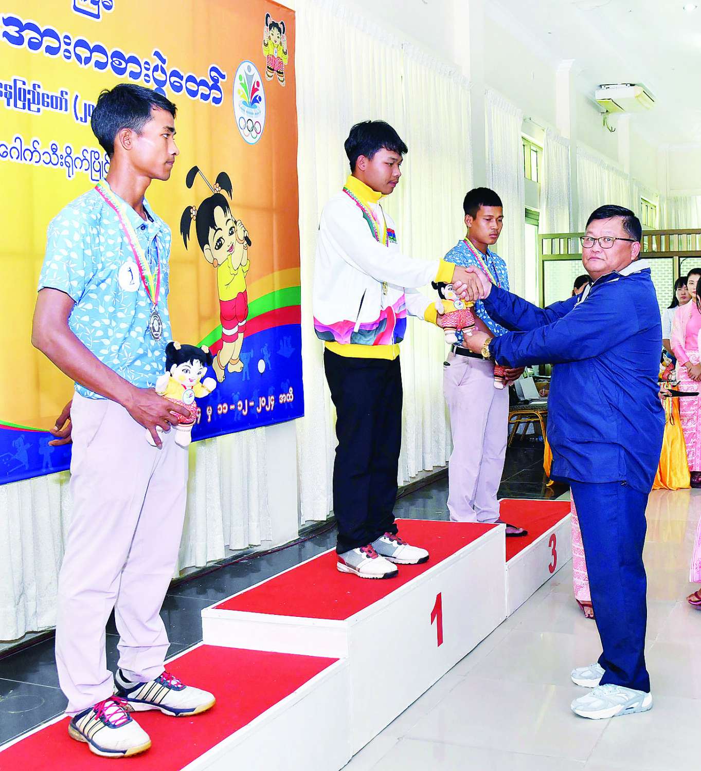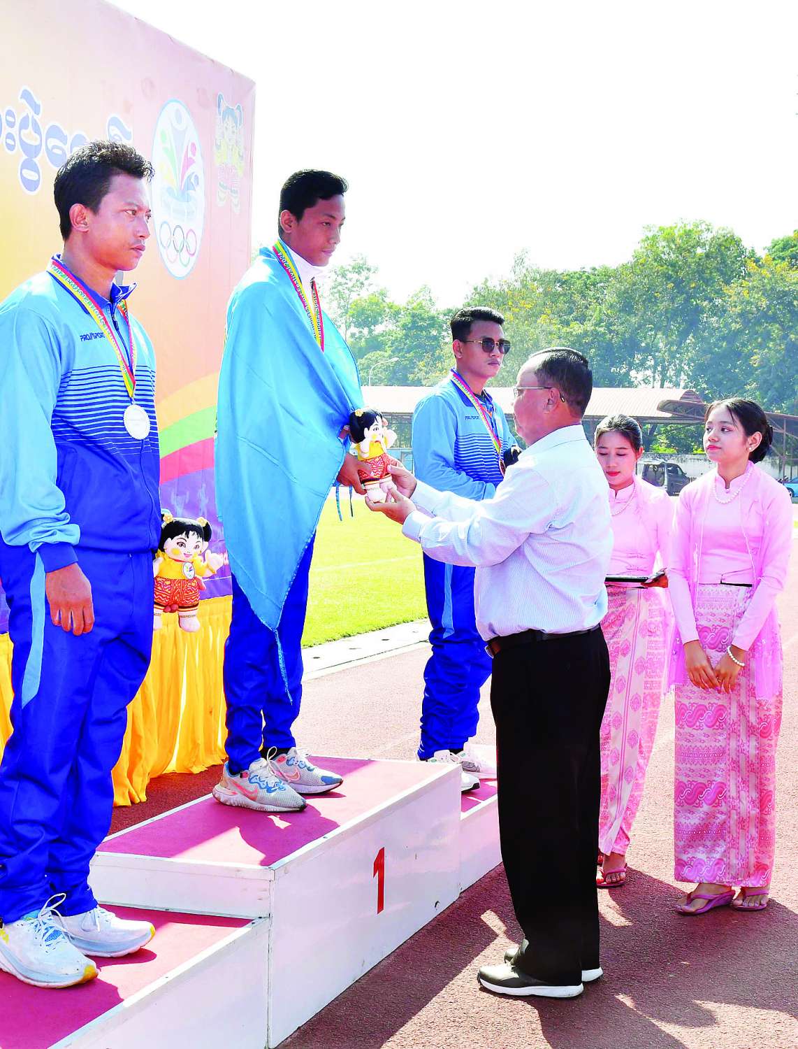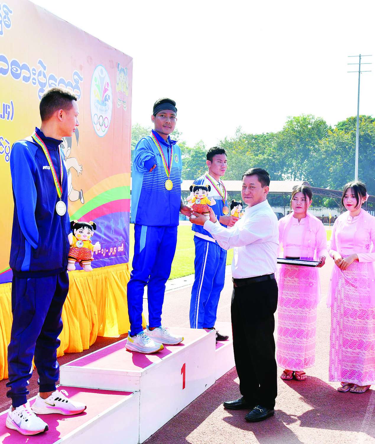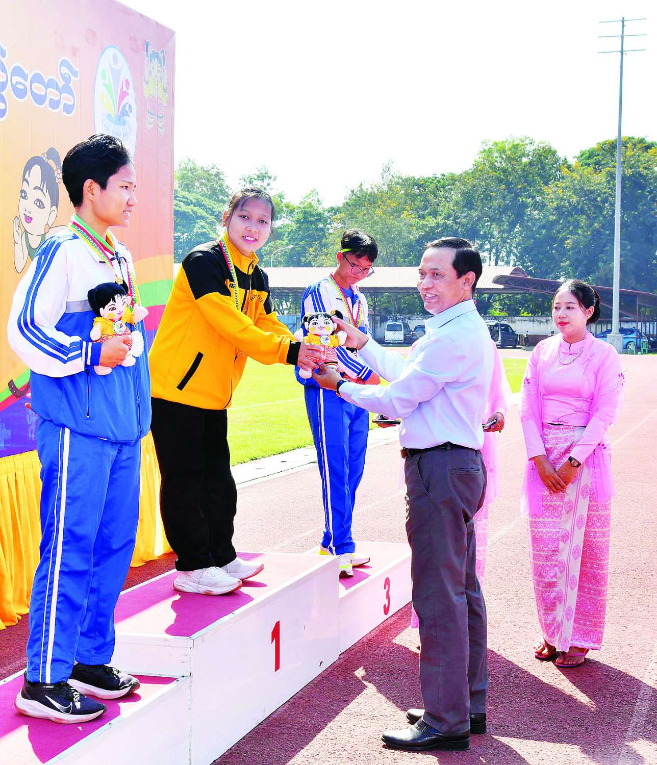 ယင်းနောက် နိုင်ငံတော်စီမံအုပ်ချုပ်ရေးကောင်စီအဖွဲ့ဝင် ခွန်စံလွင်က အမျိုးသားမီတာ (၁၀၀) T46/47 အပြေးပြိုင်ပွဲတွင် ပထမဆုရရှိသည့် ပဲခူးတိုင်းဒေသကြီး၊ ဒုတိယဆုရရှိသည့် မန္တလေးတိုင်းဒေသကြီးနှင့် တတိယဆုရရှိသည့် ဧရာဝတီတိုင်းဒေသကြီးအသင်းတို့မှ ပြိုင်ပွဲဝင်များကိုလည်းကောင်း၊ အမျိုးသားလှံတံပစ် F 64 ပြိုင်ပွဲတွင် ပထမဆုရရှိသည့် ပဲခူးတိုင်းဒေသကြီး၊ ဒုတိယဆုရရှိသည့် ပြည်ထောင်စုနယ်မြေ နေပြည်တော်နှင့် တတိယဆုရရှိသည့် မန္တလေးတိုင်းဒေသကြီးအသင်းတို့မှ ပြိုင်ပွဲဝင်များကိုလည်းကောင်း၊ အမျိုးသား မီတာ (၁၀၀) T64 ပြိုင်ပွဲတွင် ပထမဆုရရှိသည့် မွန်ပြည်နယ်၊ ဒုတိယဆုရရှိသည့် မန္တလေး တိုင်းဒေသကြီးနှင့် တတိယဆုရရှိသည့် ဧရာဝတီတိုင်းဒေသကြီးတို့မှ ပြိုင်ပွဲဝင်များကိုလည်းကောင်း ဂုဏ်ပြုဆုတံဆိပ်နှင့် အမျိုးသားအားကစားပွဲတော် အထိမ်းအမှတ်အရုပ်အား ပေးအပ်ချီးမြှင့်သည်။