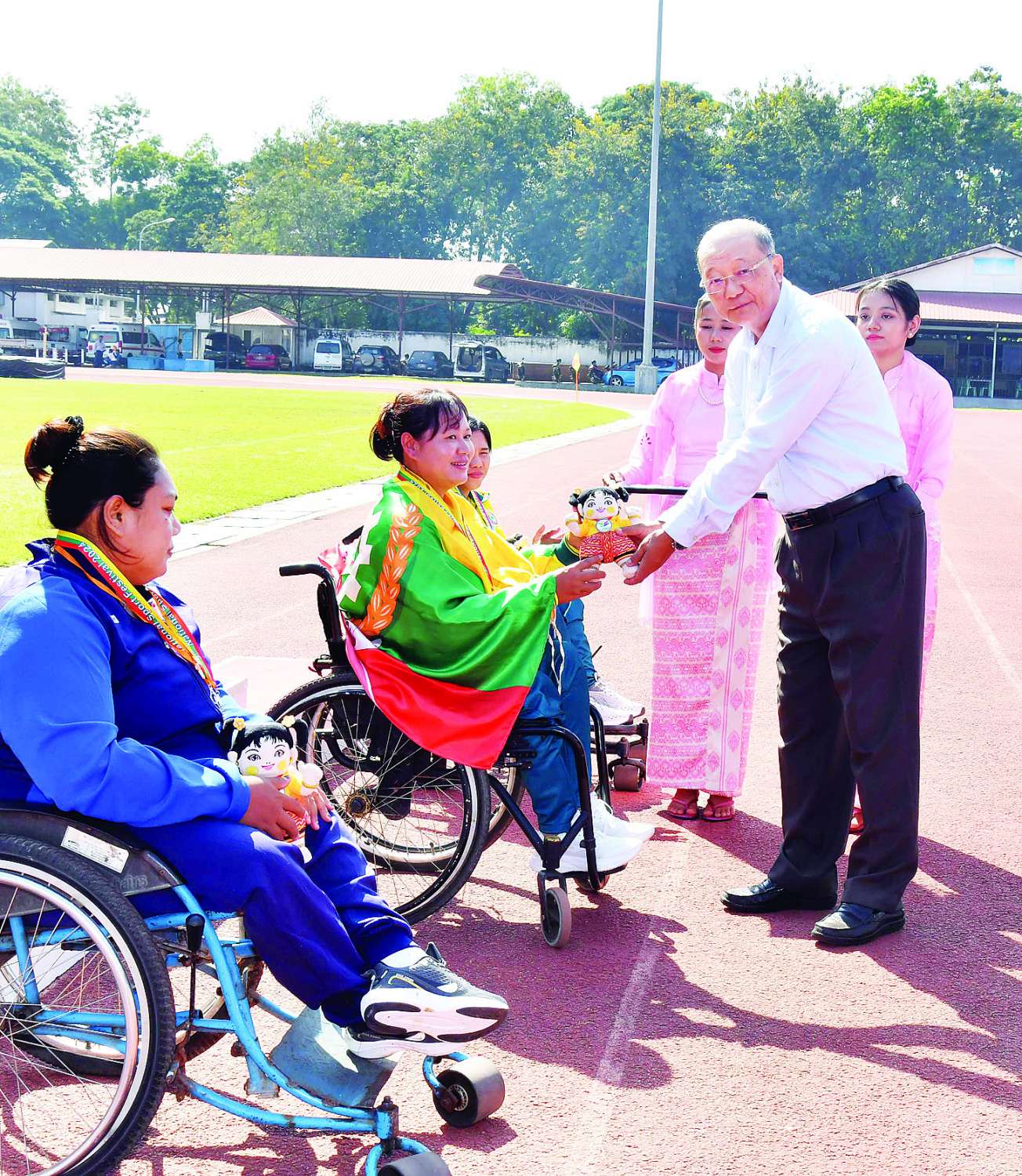 ဆက်လက်၍ ဆောက်လုပ်ရေးဝန်ကြီးဌာန ဒုတိယဝန်ကြီး ဦးဝင်းဖေက အမျိုးသား မီတာ(၈၀၀) T 46/47 အပြေးပြိုင်ပွဲတွင် ပထမဆုရရှိသည့် မန္တလေးတိုင်းဒေသကြီး၊ ဒုတိယဆုရရှိသည့် ဧရာဝတီတိုင်းဒေသကြီးနှင့် တတိယဆုရရှိသည့် ပဲခူးတိုင်းဒေသကြီးအသင်းတို့မှ ပြိုင်ပွဲဝင်များကိုလည်းကောင်း၊ အမျိုးသား အလျားခုန် T 42 ပြိုင်ပွဲတွင် ပထမဆုရရှိသည့် ပြည်ထောင်စုနယ်မြေနေပြည်တော်၊ ဒုတိယနှင့်တတိယဆုရရှိသည့် ပဲခူးတိုင်းဒေသကြီးအသင်းတို့မှ ပြိုင်ပွဲဝင်များကိုလည်းကောင်း၊ ကျန်းမာရေးဝန်ကြီးဌာန ဒုတိယဝန်ကြီး ဒေါက်တာအေးထွန်းက အမျိုးသမီးလှံတံပစ် F 44/62/63/64 ပြိုင်ပွဲတွင် ပထမဆုရရှိသည့် မွန်ပြည်နယ်၊ ဒုတိယဆုရရှိသည့် ပဲခူးတိုင်းဒေသကြီးနှင့် တတိယဆုရရှိသည့် ပြည်ထောင်စုနယ်မြေ နေပြည်တော်အသင်းတို့မှ ပြိုင်ပွဲဝင်အသင်းများကိုလည်းကောင်း၊ အမျိုးသမီး မီတာ (၁၀၀) T44/64 အပြေးပြိုင်ပွဲတွင် ပထမဆုရရှိသည့် မွန်ပြည်နယ်၊ ဒုတိယနှင့် တတိယဆုရရှိသည့် ဧရာဝတီတိုင်းဒေသကြီးအသင်းတို့မှ ပြိုင်ပွဲဝင်များကိုလည်းကောင်း ဂုဏ်ပြုဆုတံဆိပ်နှင့် အမျိုးသားအားကစားပွဲတော် အထိမ်းအမှတ်အရုပ်အား ပေးအပ်ချီးမြှင့်ကြသည်။