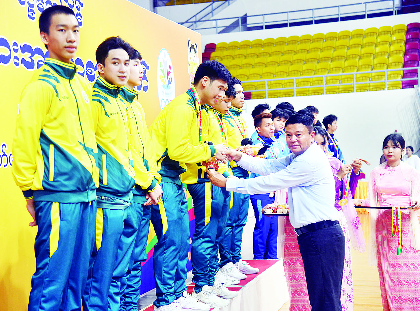 ထို့နောက် နိုင်ငံတော်စီမံအုပ်ချုပ်ရေးကောင်စီအဖွဲ့ဝင် ဒုတိယဝန်ကြီးချုပ်နှင့် ပြည်ထောင်စုဝန်ကြီး ဗိုလ်ချုပ်ကြီး မြထွန်းဦးက အသင်းလိုက် (အကျောပေး) ပြိုင်ပွဲတွင် ပထမဆုရရှိသည့် ပြည်ထောင်စုနယ်မြေနေပြည်တော်၊ ဒုတိယဆုရရှိသည့် ရှမ်းပြည်နယ်နှင့် တတိယဆုရရှိသည့် ပဲခူးတိုင်းဒေသကြီးတို့မှ ပြိုင်ပွဲဝင်များကို တစ်ဦးချင်း ဂုဏ်ပြုဆုတံဆိပ်နှင့် အမျိုးသားအားကစားပွဲတော် အထိမ်းအမှတ်အရုပ်အား ပေးအပ်ချီးမြှင့်သည်။
