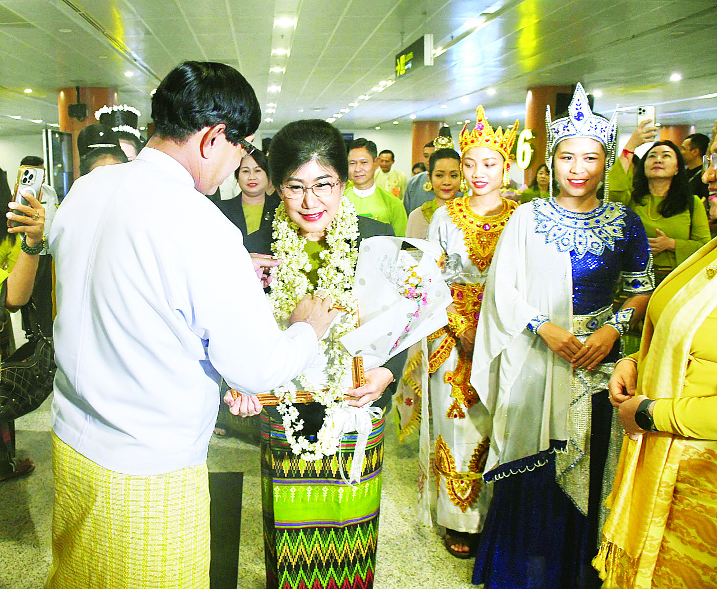 အဆိုပါ မြန်မာကိုယ်စားလှယ်အဖွဲ့အား ရန်ကုန်တိုင်းဒေသကြီးဝန်ကြီးချုပ် ဦးစိုးသိန်းနှင့်ဇနီး၊ တိုင်းဒေသကြီးဝန်ကြီးများနှင့် ၎င်းတို့၏ဇနီးများ၊ အမျိုးသမီးရေးရာအဖွဲ့၊ မိခင်နှင့်ကလေးစောင့်ရှောက်မှု ကြီးကြပ်ရေးအဖွဲ့နှင့် ရှေးဟောင်းသုတေသနဦးစီးဌာနမှ တာဝန်ရှိသူများ၊ အနုပညာရှင်များ၊ တိုင်းရင်းသားတိုင်းရင်းသူများ၊ ကျောင်းသားကျောင်းသူများ၊ ယိမ်းအဖွဲ့များ၊ အမေများအဖွဲ့၊ ရုပ်ရှင်၊ သဘင်၊ ဂီတ၊ ပန်းချီ၊ ပန်းပု စသောရိုးရာပန်းပညာရှင်များ၊ ဝံသာနုအသင်းအဖွဲ့များ၊ တာဝန်ရှိသူများနှင့် ပြည်သူများက စုပေါင်းကြိုဆိုကြသည်။