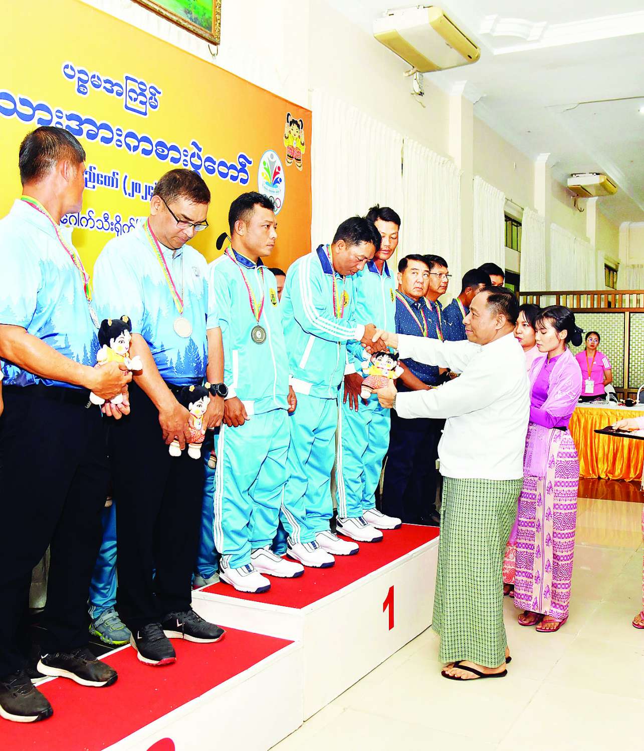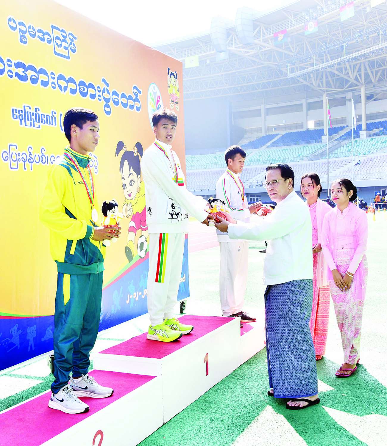 ၂၀၂၄ ခုနှစ် ပဉ္စမအကြိမ် အမျိုးသားအားကစားပွဲတော် ဝန်ကြီးဌာနအဆင့်နှင့် ပြည်နယ်နှင့်တိုင်းဒေသကြီးအဆင့်ပြိုင်ပွဲများ၏ ဗိုလ်လုပွဲနှင့် ဆုချီးမြှင့်ပွဲအခမ်းအနားများကို ယနေ့တွင် နေပြည်တော်ရှိ သက်ဆိုင်ရာအားကစားကွင်းနှင့် အားကစားရုံများ၌ကျင်းပရာ နိုင်ငံတော်စီမံအုပ်ချုပ်ရေးကောင်စီဝင်များ တက်ရောက်ကြည့်ရှုအားပေးပြီး ဆုများချီးမြှင့်ကြသည်။