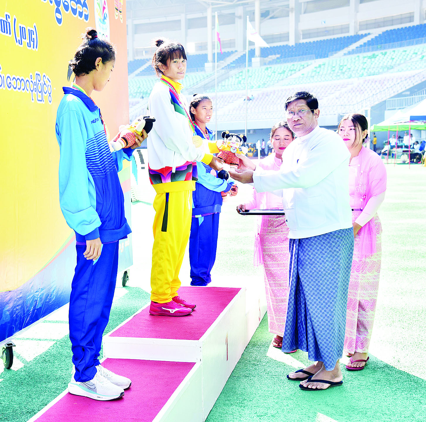 ပြည်နယ်နှင့် တိုင်းဒေသကြီးအဆင့် အသက်(၂၁)နှစ်အောက် ပြေးခုန်ပစ်ပြိုင်ပွဲ ဆုချီးမြှင့်ပွဲအခမ်းအနားကို ဝဏ္ဏသိဒ္ဓိဘောလုံးကွင်း၌ကျင်းပရာ ဒုတိယဝန်ကြီး ဦးဇင်မင်းထက်က အမျိုးသမီး ကြိုးတပ်သံလုံးပစ်ပြိုင်ပွဲတွင် ပထမနှင့် ဒုတိယဆုရရှိသည့် မကွေးတိုင်းဒေသကြီးနှင့် တတိယဆုရရှိသည့် ရှမ်းပြည်နယ်အသင်းတို့မှ ပြိုင်ပွဲဝင်များကိုလည်းကောင်း၊ ဒုတိယဝန်ကြီး ဦးမင်းမင်းက အမျိုးသမီးသုံးဆင့်ခုန်ပြိုင်ပွဲတွင် ပထမဆုရရှိသည့် ဧရာဝတီတိုင်းဒေသကြီး၊ ဒုတိယဆုရရှိသည့် ပြည်ထောင်စုနယ်မြေ နေပြည်တော်နှင့် တတိယဆုရရှိသည့် စစ်ကိုင်းတိုင်းဒေသကြီးအသင်းတို့မှ ပြိုင်ပွဲဝင်များကိုလည်းကောင်း တစ်ဦးချင်းဂုဏ်ပြုဆုတံဆိပ်နှင့် အမျိုးသားအားကစားပွဲတော် အထိမ်းအမှတ်အရုပ်အား ပေးအပ်ချီးမြှင့်ကြသည်။