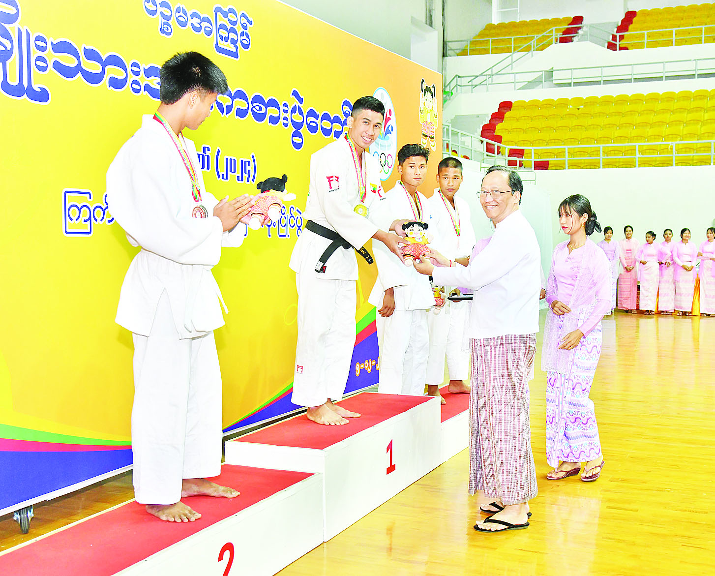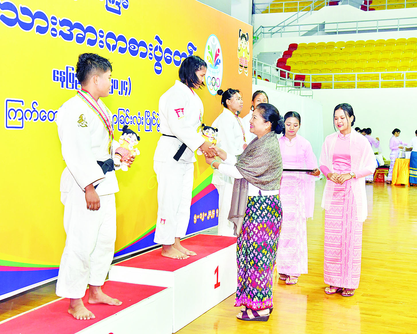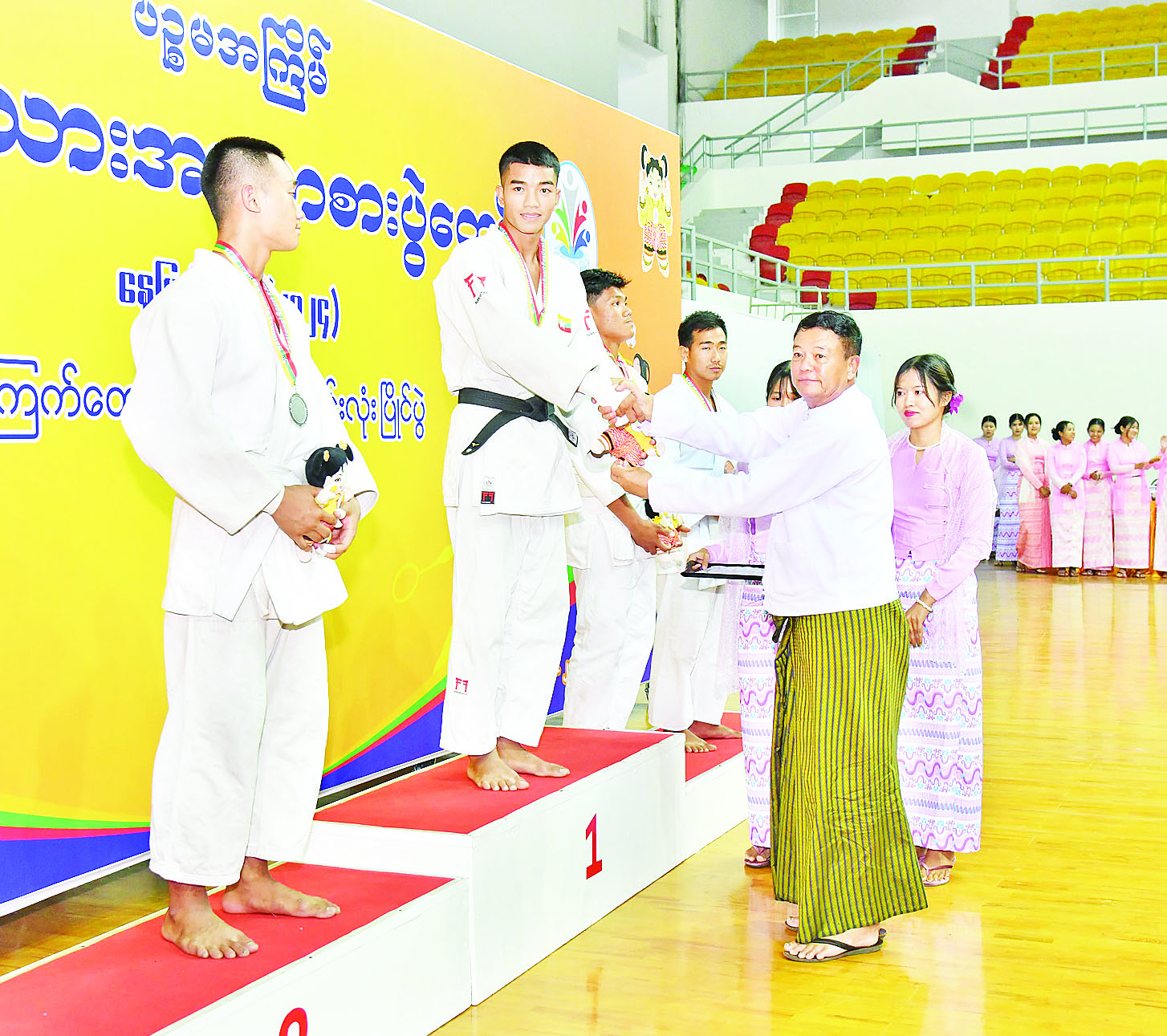 ထို့နောက် နိုင်ငံတော်စီမံအုပ်ချုပ်ရေးကောင်စီအဖွဲ့ဝင် ဦးရန်ကျော်က အမျိုးသမီး (-၄၈ ကီလိုတန်း) ဂျူဒိုအတိုက်ပြိုင်ပွဲတွင် ပထမဆုရရှိသည့် ကချင်ပြည်နယ်၊ ဒုတိယဆုရရှိသည့် ဧရာဝတီတိုင်းဒေသကြီးနှင့် ပူးတွဲတတိယဆုရရှိသည့် မန္တလေးတိုင်းဒေသကြီးနှင့် ရန်ကုန်တိုင်းဒေသကြီးအသင်းတို့မှ ပြိုင်ပွဲဝင်များကိုလည်းကောင်း၊ နိုင်ငံတော်စီမံအုပ်ချုပ်ရေးကောင်စီအဖွဲ့ဝင် ဦးရွှေကြိမ်းက အမျိုးသမီး (-၅၂ ကီလိုတန်း) ဂျူဒိုအတိုက်ပြိုင်ပွဲတွင် ပထမဆုရရှိသည့် ဧရာဝတီတိုင်းဒေသကြီး၊ ဒုတိယဆုရရှိသည့် မွန်ပြည်နယ်နှင့် ပူးတွဲတတိယဆုရရှိသည့် ချင်းပြည်နယ်နှင့် ကချင်ပြည်နယ်အသင်းတို့မှ ပြိုင်ပွဲဝင်များကိုလည်းကောင်း၊ နိုင်ငံတော် စီမံအုပ်ချုပ်ရေးကောင်စီအဖွဲ့ဝင် ဒေါ်ဒွဲဘူကအမျိုးသမီး (- ၅၇ ကီလိုတန်း) ဂျူဒိုအတိုက်ပြိုင်ပွဲတွင် ပထမဆုရရှိသည့် စစ်ကိုင်းတိုင်းဒေသကြီး၊ ဒုတိယဆုရရှိသည့် ကချင်ပြည်နယ်နှင့် ပူးတွဲတတိယဆုရရှိသည့် မန္တလေးတိုင်းဒေသကြီးနှင့် ရှမ်းပြည်နယ်အသင်းတို့မှ ပြိုင်ပွဲဝင်များ ကိုလည်းကောင်း တစ်ဦးချင်းဂုဏ်ပြု ဆုတံဆိပ်နှင့် အမျိုးသားအားကစား ပွဲတော်အထိမ်းအမှတ်အရုပ်အား ပေးအပ်ချီးမြှင့်ကြသည်။
