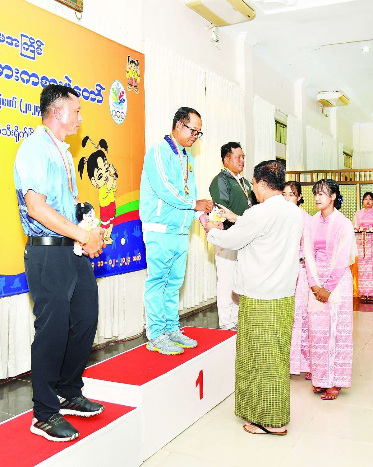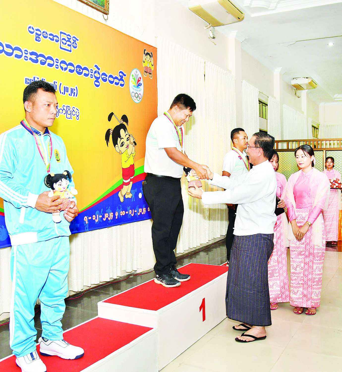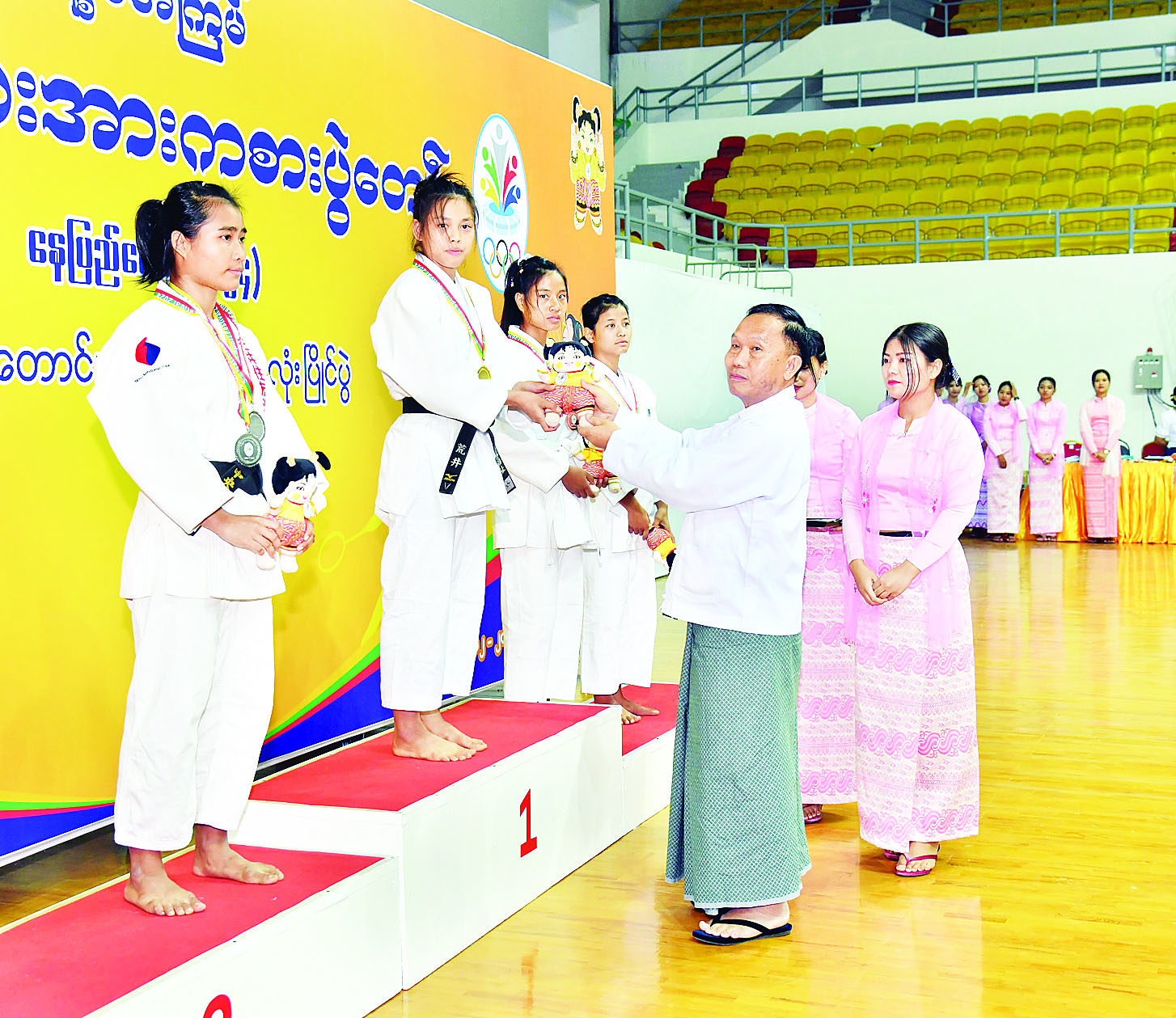 ထို့နောက် နိုင်ငံတော်စီမံအုပ်ချုပ်ရေးကောင်စီအဖွဲ့ဝင် ဦးရန်ကျော်က အမျိုးသမီး (-၄၈ ကီလိုတန်း) ဂျူဒိုအတိုက်ပြိုင်ပွဲတွင် ပထမဆုရရှိသည့် ကချင်ပြည်နယ်၊ ဒုတိယဆုရရှိသည့် ဧရာဝတီတိုင်းဒေသကြီးနှင့် ပူးတွဲတတိယဆုရရှိသည့် မန္တလေးတိုင်းဒေသကြီးနှင့် ရန်ကုန်တိုင်းဒေသကြီးအသင်းတို့မှ ပြိုင်ပွဲဝင်များကိုလည်းကောင်း၊ နိုင်ငံတော်စီမံအုပ်ချုပ်ရေးကောင်စီအဖွဲ့ဝင် ဦးရွှေကြိမ်းက အမျိုးသမီး (-၅၂ ကီလိုတန်း) ဂျူဒိုအတိုက်ပြိုင်ပွဲတွင် ပထမဆုရရှိသည့် ဧရာဝတီတိုင်းဒေသကြီး၊ ဒုတိယဆုရရှိသည့် မွန်ပြည်နယ်နှင့် ပူးတွဲတတိယဆုရရှိသည့် ချင်းပြည်နယ်နှင့် ကချင်ပြည်နယ်အသင်းတို့မှ ပြိုင်ပွဲဝင်များကိုလည်းကောင်း၊ နိုင်ငံတော် စီမံအုပ်ချုပ်ရေးကောင်စီအဖွဲ့ဝင် ဒေါ်ဒွဲဘူကအမျိုးသမီး (- ၅၇ ကီလိုတန်း) ဂျူဒိုအတိုက်ပြိုင်ပွဲတွင် ပထမဆုရရှိသည့် စစ်ကိုင်းတိုင်းဒေသကြီး၊ ဒုတိယဆုရရှိသည့် ကချင်ပြည်နယ်နှင့် ပူးတွဲတတိယဆုရရှိသည့် မန္တလေးတိုင်းဒေသကြီးနှင့် ရှမ်းပြည်နယ်အသင်းတို့မှ ပြိုင်ပွဲဝင်များ ကိုလည်းကောင်း တစ်ဦးချင်းဂုဏ်ပြု ဆုတံဆိပ်နှင့် အမျိုးသားအားကစား ပွဲတော်အထိမ်းအမှတ်အရုပ်အား ပေးအပ်ချီးမြှင့်ကြသည်။