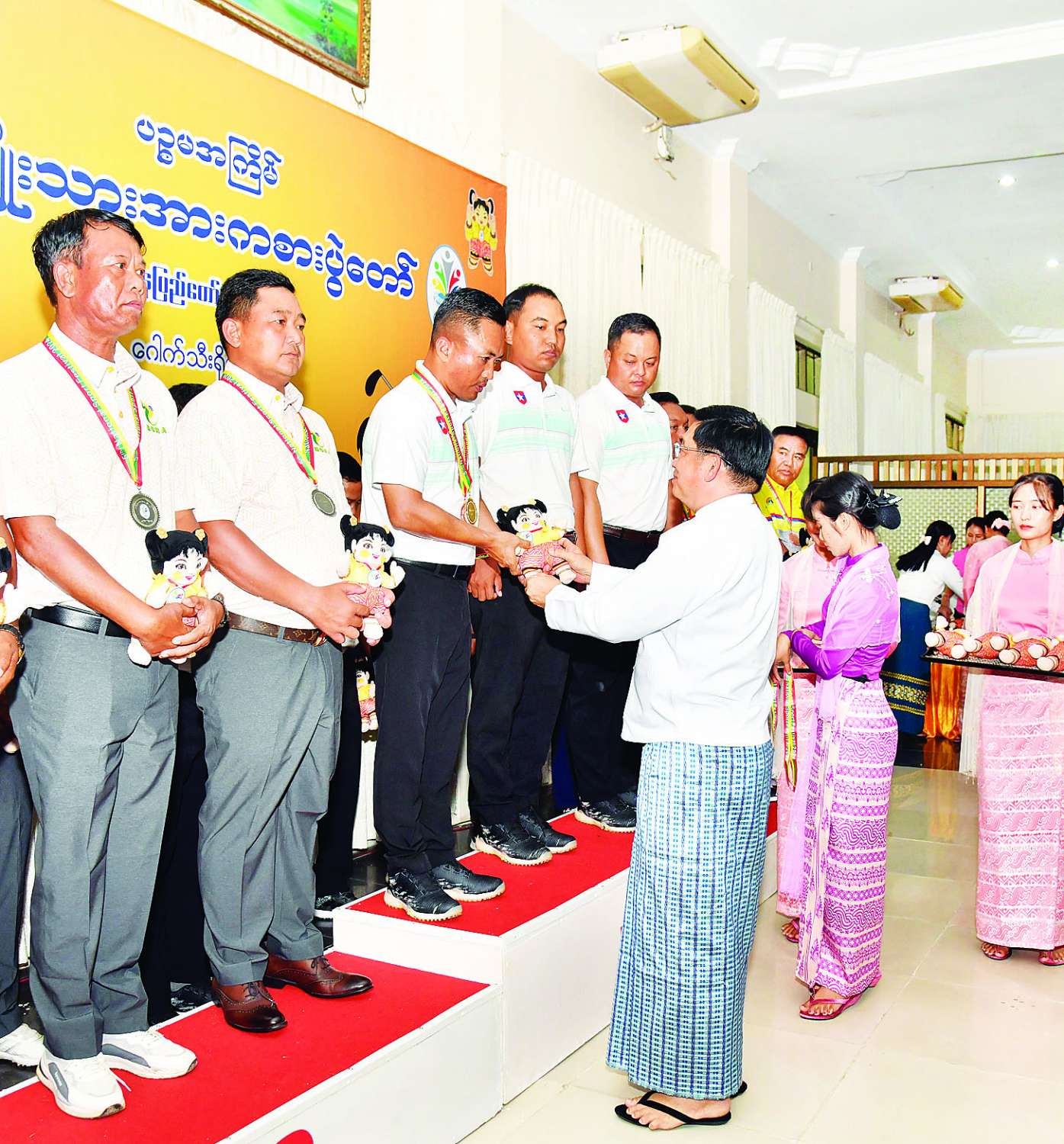 အခမ်းအနားတွင် မြန်မာနိုင်ငံ ဂေါက်သီးအဖွဲ့ချုပ်ဥက္ကဋ္ဌ ဦးကိုကိုအေးက Hole in One Prize ဆုရရှိသည့် ပို့ဆောင်ရေးနှင့်ဆက်သွယ်ရေးဝန်ကြီးဌာနအသင်းမှ ဦးမျိုးလွင်ဦးအား ဂုဏ်ပြုဆုနှင့် အမျိုးသားအားကစားပွဲတော် အထိမ်းအမှတ်အရုပ်အား ပေးအပ်ချီးမြှင့်သည်။