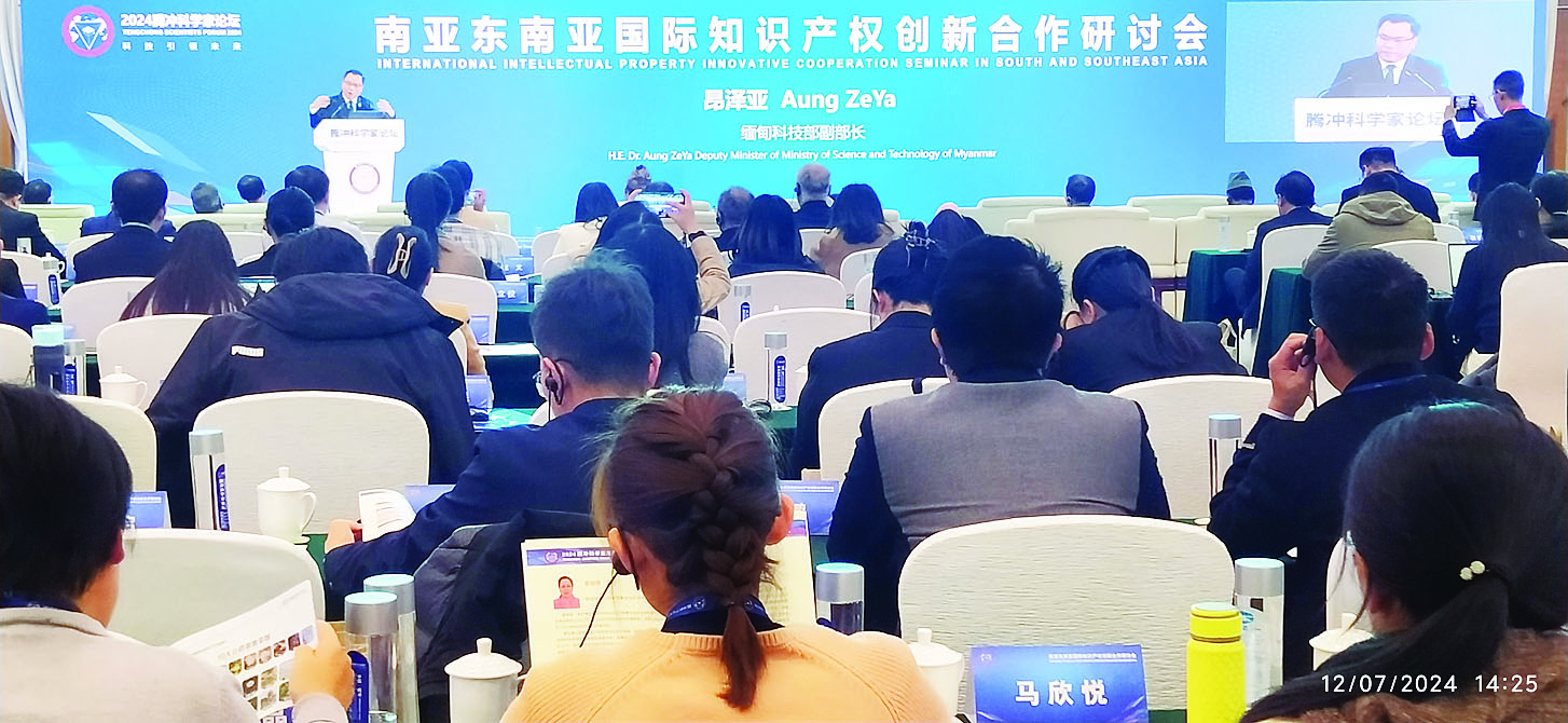 မွန်းလွဲပိုင်း၌ ဖိုရမ်(၂၀၂၄) အစီအစဉ်အရကျင်းပသော International Intellectual Property Innovative Cooperation Seminar in South and Southeast Asia ဖွင့်ပွဲအခမ်းအနားသို့ တောင်အာရှနှင့် အရှေ့တောင်အာရှခုနစ်နိုင်ငံမှ တာဝန်ရှိသူများ တက်ရောက်ကြပြီး မူပိုင်ခွင့်ဆိုင်ရာ ဗဟိုကော်မတီဝင် ဒုတိယဝန်ကြီး ဒေါက်တာအောင်ဇေယျက နည်းပညာဆိုင်ရာ ရှာဖွေတွေ့ရှိမှုနှင့် ဖွံ့ဖြိုးတိုးတက်မှုခေတ်သစ်၌ ဉာဏပစ္စည်းမူပိုင်ခွင့်ကာကွယ်မြှင့်တင်ရေးသည် တီထွင်ဆန်းသစ်ဖန်တီးနိုင်မှု၊ သုတေသနပြုမှု၊ သိပ္ပံနှင့်နည်းပညာ တိုးတက်မှုတို့အတွက် မရှိမဖြစ် လိုအပ်ပါကြောင်း၊ နိုင်ငံတော်၌ သိပ္ပံနှင့်နည်းပညာဝန်ကြီးဌာနက ၁၉၉၆ ခုနှစ်မှစ၍ ဉာဏပစ္စည်းမူပိုင်ခွင့်ကာကွယ်ရေးနှင့် ဥပဒေများပြဋ္ဌာန်းနိုင်ရေးဆောင်ရွက်ခဲ့ပြီး ၂၀၀၁ ခုနှစ်၌ ကမ္ဘာ့ဉာဏပစ္စည်းမူပိုင်ခွင့်အဖွဲ့အစည်း (World Intellectual Property Organization- WIPO)နှင့် ကမ္ဘာ့ကုန်သွယ်ရေးအဖွဲ့အစည်း (World Trade Organization-WTO)တို့၏ အဖွဲ့ဝင်နိုင်ငံဖြစ်လာခဲ့ပါကြောင်း၊ ၂၀၁၉ ခုနှစ်တွင် မူပိုင်ခွင့်ဥပဒေ၌ (Patent Law) ပြဋ္ဌာန်း နိုင်ခဲ့ပါကြောင်း၊ နိုင်ငံတော်၌ စီးပွားရေးနှင့်ကူးသန်းရောင်းဝယ်ရေးဝန်ကြီးဌာနသည် လက်ရှိဉာဏပစ္စည်းမူပိုင်ခွင့်ဆိုင်ရာ တာဝန်ခံဝန်ကြီးဌာန ဖြစ်ပါကြောင်း။