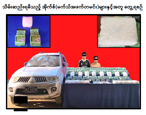 မူးယစ်ဆေးဝါးတားဆီးနှိမ်နင်းရေးရဲတပ်ဖွဲ့မှ တပ်ဖွဲ့ဝင်များပါဝင်သော ပူးပေါင်းအဖွဲ့သည် ဒီဇင်ဘာလ ၉ ရက်နေ့ နံနက် ၈ နာရီအချိန် ရှမ်းပြည်နယ်(အရှေ့ပိုင်း)၊ တာချီလိတ်မြို့နယ်၊ ဖန်မင်ကျေးရွာအုပ်စု၊ မယ်ယန်းကျေးရွာအနီးတွင် ကျိုင်းတုံဘက်မှ တာချီလိတ်ဘက်သို့ စိုင်းရွှေအောင် မောင်းနှင်ပြီး အိုက်ကော်ခမ်းလိုက်ပါလာသည့် MITSUBISHI PAJERO မော်တော်ယာဉ်ကို သတင်းအရရှာဖွေရာယာဉ်ပေါ်မှ ဒေသကာလတန်ဖိုးငွေကျပ်သိန်း ၉,၂၀၀ တန်ဖိုးရှိ အိုက်စ်(မက်သ်အဖက်တမင်း) ၁၁၅ ကီလို သိမ်းဆည်းရမိခဲ့ပြီး စစ်ဆေးဖော်ထုတ်ချက်အရ သိမ်းဆည်းရမိ အိုက်စ်(မက်သ်အဖက်တမင်း)များအား မိုင်းပျဉ်းမြို့နယ်မှ တာချီလိတ်မြို့နယ်သို့ သယ်ဆောင်ရောင်းဝယ်ခြင်းဖြစ်ကြောင်း သိရှိရသဖြင့် ၎င်းတို့အား ဥပဒေအရ အရေးယူထားရှိပြီး ကွင်းဆက်ပြစ်မှုကျူးလွန်သူများအား ဆက်လက်စစ်ဆေးဖော်ထုတ်လျက်ရှိကြောင်း မြန်မာနိုင်ငံရဲတပ်ဖွဲ့မှ သတင်းရရှိသည်။