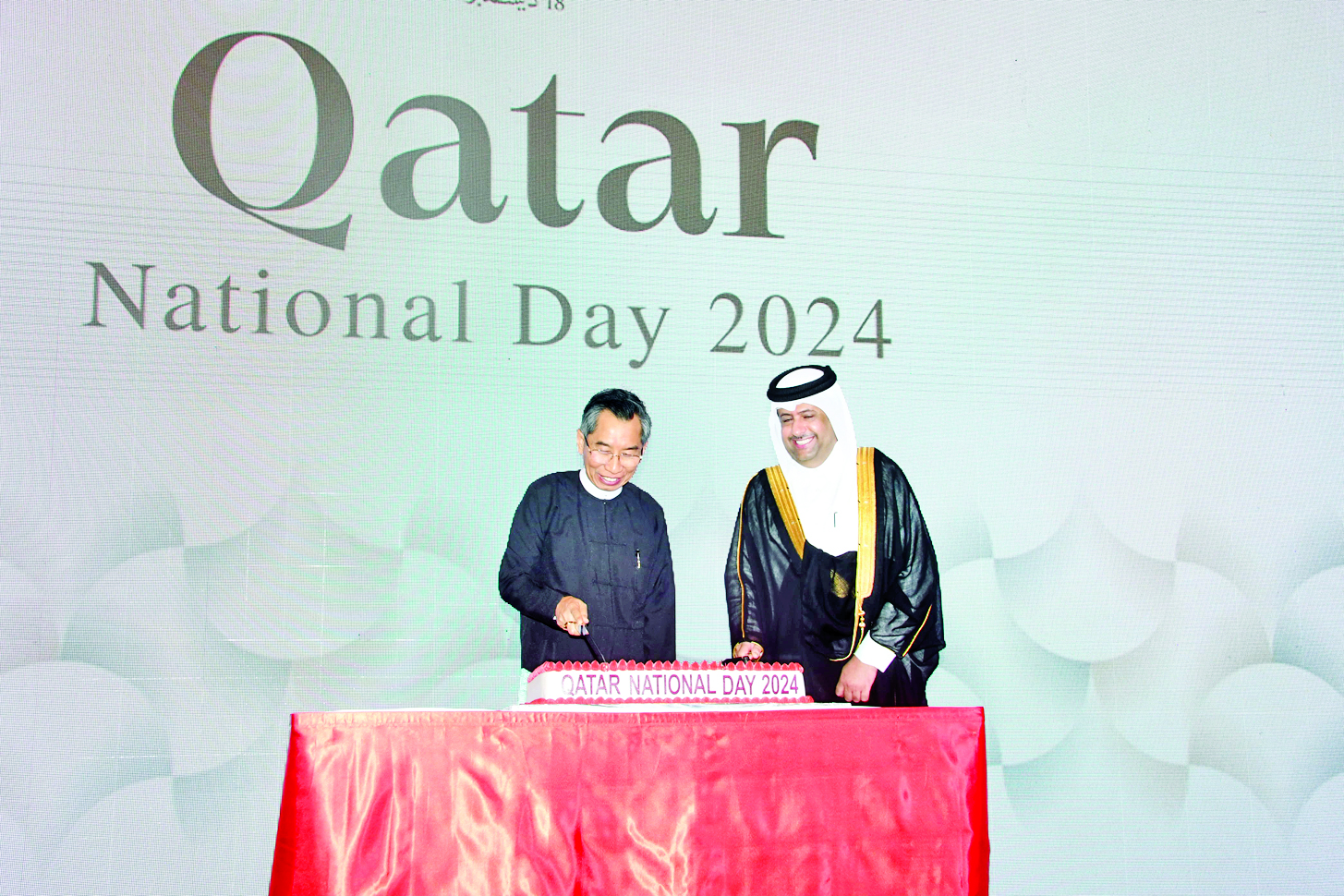 ယင်းနောက် ပြည်ထောင်စုဝန်ကြီးနှင့် ကာတာနိုင်ငံ သံရုံးတာဝန်ခံတို့သည် အထိမ်းအမှတ်ကိတ်ကို လှီးဖြတ်ပေးကြပြီး တက်ရောက်လာကြသူများနှင့်အတူ စုပေါင်းမှတ်တမ်းတင်ဓာတ်ပုံရိုက်ကာ ကာတာနိုင်ငံသံရုံးတာဝန်ခံက တက်ရောက်လာကြသူများအား ညစာစားပွဲဖြင့် တည်ခင်းဧည့်ခံသည်။