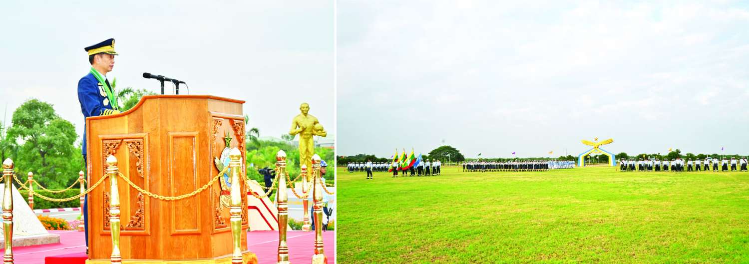 ဦးစွာ စစ်ရေးပြအခမ်းအနားအား အစီအစဉ်အတိုင်း ကျင်းပပြုလုပ်ရာ နိုင်ငံတော်အလံနှင့် ကျဆုံးလေပြီးသော တပ်မတော်သားအပေါင်းအား အလေးပြုခြင်း၊ သစ္စာလေးချက်ရွတ်ဆိုခြင်းများ ဆောင်ရွက်၍ ကာကွယ်ရေးဦးစီးချုပ် (လေ) က စစ်ရေးပြတပ်ခွဲများအား စစ်ဆေးသည်။