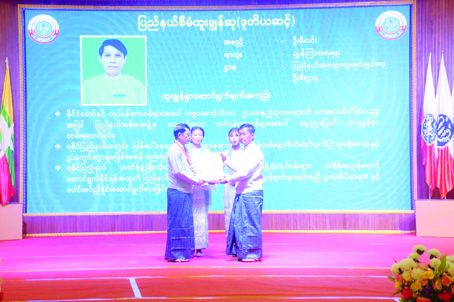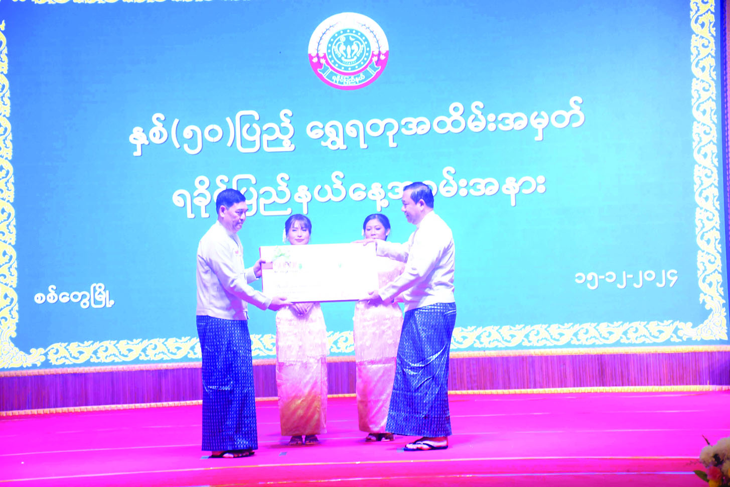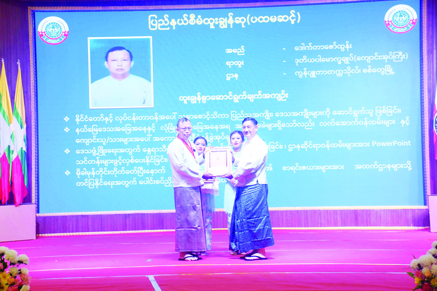 ထို့နောက် နိုင်ငံတော်စီမံအုပ်ချုပ်ရေးကောင်စီအဖွဲ့ဝင် ဒေါက်တာဘရွှေနှင့် ဒေါက်တာမှုထန်တို့က ပြည်နယ်စီမံထူးချွန်ဆု (ပထမဆင့်) ရရှိသူများ၊ ပြည်နယ်စက်မှုစီးပွားထူးချွန်ဆု (ပထမဆင့်) ရရှိသူများ၊ ပြည်နယ်လူမှုထူးချွန်ဆု (ပထမဆင့်) ရရှိသူများအား ဂုဏ်ထူးဆောင်ဆုလက်မှတ်နှင့် ဂုဏ်ထူးဆောင်ဆုပစ္စည်းများ ပေးအပ်ချီးမြှင့် ကြသည်။