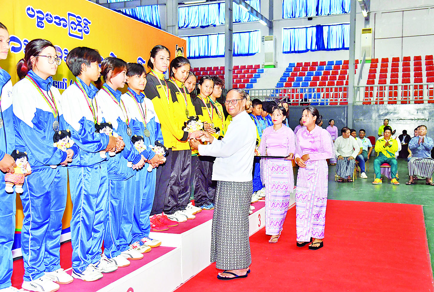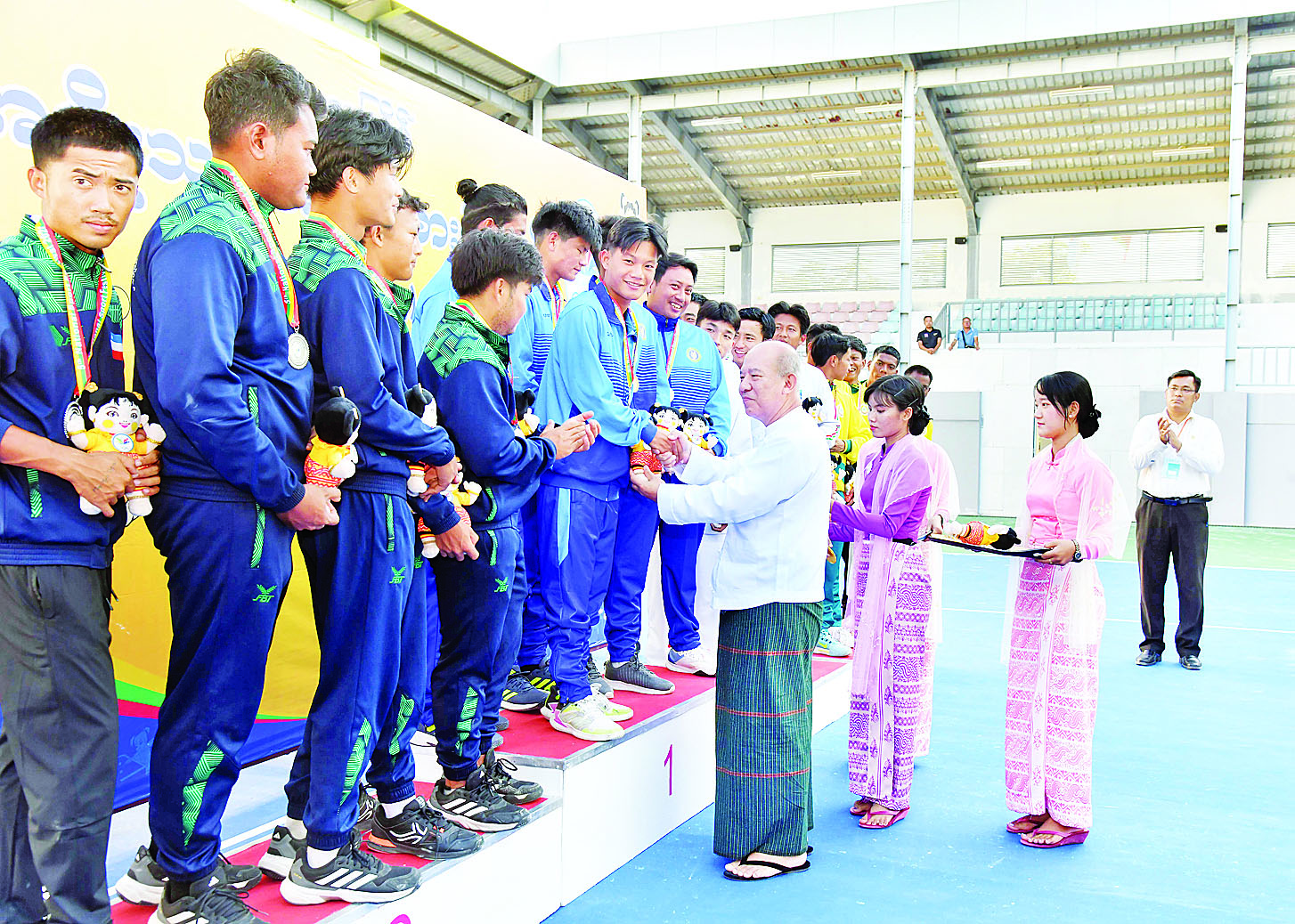 ထို့နောက် ဆုချီးမြှင့်ပွဲအခမ်းအနားကို ဆက်လက်ကျင်းပရာ ပြည်ထောင်စုစာရင်းစစ်ချုပ် ဒေါက်တာခင်နိုင်ဦးက အမျိုးသမီးအသင်းလိုက်ပြိုင်ပွဲတွင် ပထမဆုရရှိသည့် မန္တလေးတိုင်းဒေသကြီး၊ ဒုတိယဆုရရှိသည့် ပဲခူးတိုင်းဒေသကြီး၊ ပူးတွဲတတိယဆုရရှိသည့် ကချင်ပြည်နယ်နှင့် ကရင်ပြည်နယ်အသင်းတို့မှ ပြိုင်ပွဲဝင်များကိုလည်းကောင်း၊ နိုင်ငံတော်ဖွဲ့စည်းပုံ အခြေခံဥပဒေဆိုင်ရာခုံရုံးဥက္ကဋ္ဌ ဦးအောင်ဇော်သိန်းက အမျိုးသားအသင်းလိုက်ပြိုင်ပွဲတွင် ပထမဆုရရှိသည့် ပဲခူးတိုင်းဒေသကြီး၊ ဒုတိယဆုရရှိသည့် ကရင်ပြည်နယ်၊ ပူးတွဲတတိယဆုရရှိသည့် ရန်ကုန်တိုင်းဒေသကြီးနှင့် ကချင်ပြည်နယ်အသင်းတို့မှ ပြိုင်ပွဲဝင်များကိုလည်းကောင်း တစ်ဦးချင်းဂုဏ်ပြုဆုတံဆိပ်နှင့် အမျိုးသားအားကစားပွဲတော် အထိမ်းအမှတ်အရုပ်များအား ပေးအပ်ချီးမြှင့်ကြသည်။