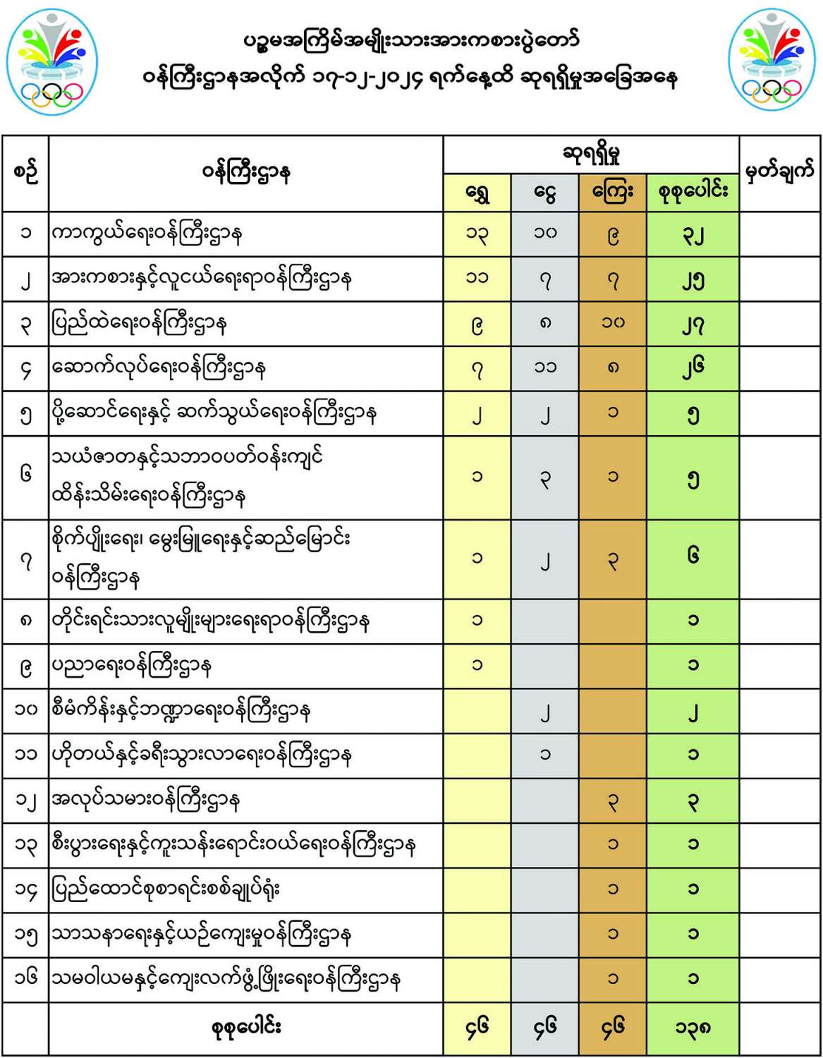 ပဉ္စမအကြိမ်အမျိုးသားအားကစားပွဲတော် ဝန်ကြီးဌာနအလိုက် ၁၇-၁၂-၂၀၂၄ ရက်နေ့အထိ ဆုရရှိမှုအခြေအနေ