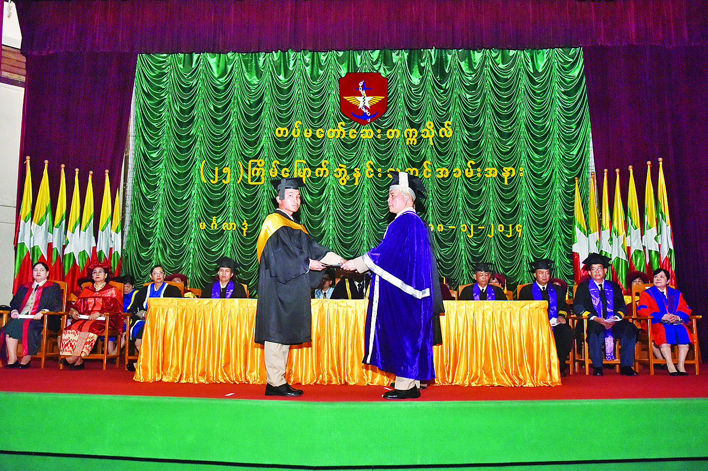 ဆက်လက်၍ ပါမောက္ခချုပ်က ဆေးပညာဘွဲ့နှင့် သွားဘက်ဆိုင်ရာဆေးပညာဘွဲ့ ရရှိသူတို့အား ဘွဲ့လက်မှတ်များချီးမြှင့်အပ်နှင်းသည်။ ထို့နောက် ပါမောက္ခချုပ်က ဘွဲ့ရသူများအား ဘွဲ့များနှင့်လျော်ညီသော အဆောင်အယောင်အမှတ်လက္ခဏာဖြစ်သည့်ဝတ်ရုံများကို ဝတ်ဆင်ခွင့်ပြုခဲ့ပြီး ဘွဲ့နှင်းသဘင်မှတ်တမ်းစာအုပ်တွင် လက်မှတ်ရေးထိုးသည်။