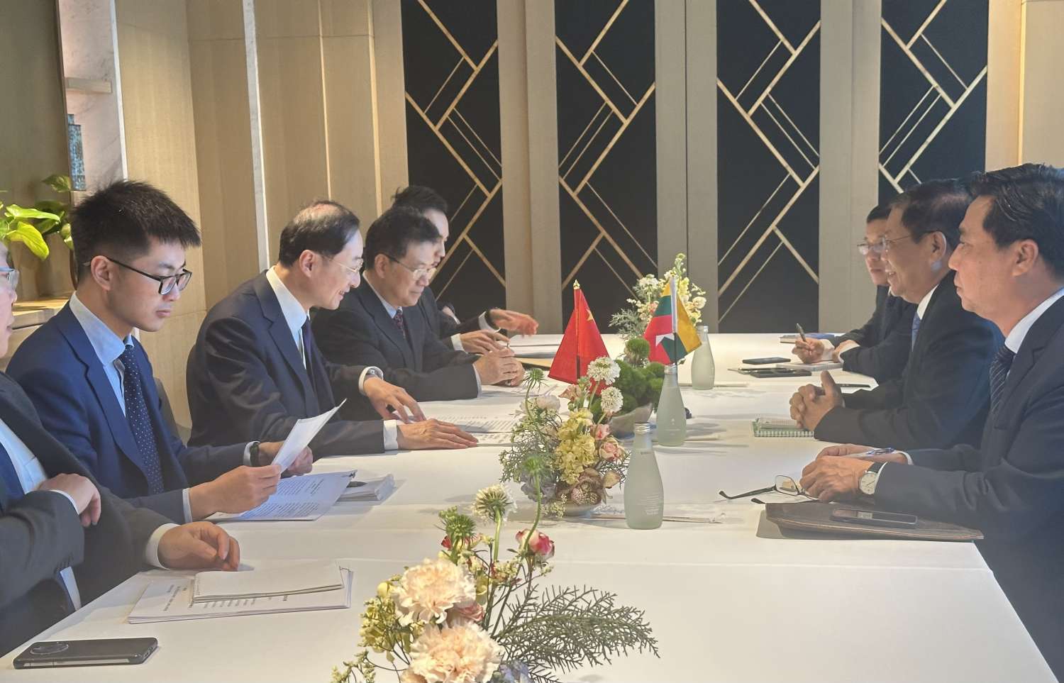 ဒုတိယဝန်ကြီးချုပ်နှင့် နိုင်ငံခြားရေးဝန်ကြီးဌာန ပြည်ထောင်စုဝန်ကြီးသည် ဆွေးနွေးပွဲအတွင်း နိုင်ငံတော်အစိုးရ၏ ငြိမ်းချမ်းရေး၊ ဖွံ့ဖြိုးတိုးတက်ရေးနှင့် ဒီမိုကရေစီဖော်ဆောင်ရေးအတွက် ကြိုးပမ်းဆောင်ရွက်နေမှုများနှင့် မြန်မာနိုင်ငံ၏ လက်ရှိဖြစ်ပေါ်တိုးတက်မှုအခြေအနေများကို တက်ရောက်လာကြသည့်နိုင်ငံများမှ ကိုယ်စားလှယ်အဖွဲ့ခေါင်းဆောင်များအား ရှင်းလင်းပြောကြားခဲ့သည်။
