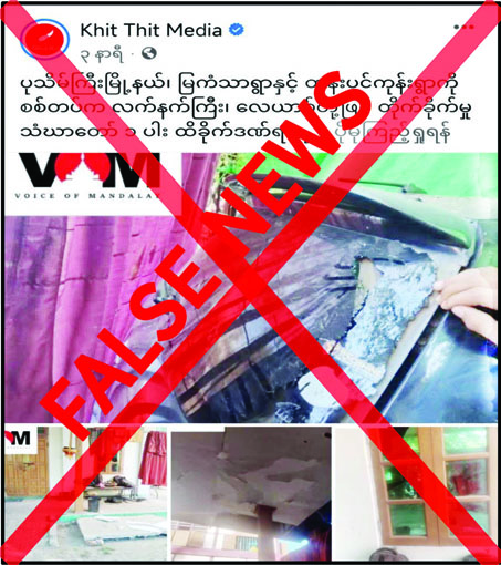 မန္တလေးတိုင်းဒေသကြီး ပုသိမ်ကြီးမြို့နယ် မြကံသာရွာနှင့် ထန်းပင်ကုန်းရွာတို့ကို ဒီဇင်ဘာ ၁၉ ရက် နံနက်ပိုင်းတွင် လေကြောင်းဖြင့် ဗုံးကြဲတိုက်ခိုက်မှုကြောင့် သံဃာတော်တစ်ပါး ထိခိုက်ဒဏ်ရာရရှိခဲ့ကြောင်း တရားမဝင်ပြည်ဖျက်မီဒီယာများက မဟုတ်မမှန်လုပ်ကြံရေးသား ဖြန့်ဝေလျက်ရှိကြောင်း သိရသည်။
