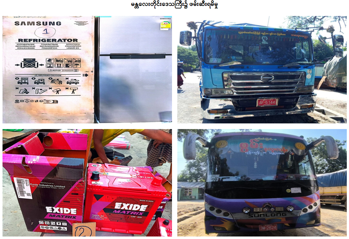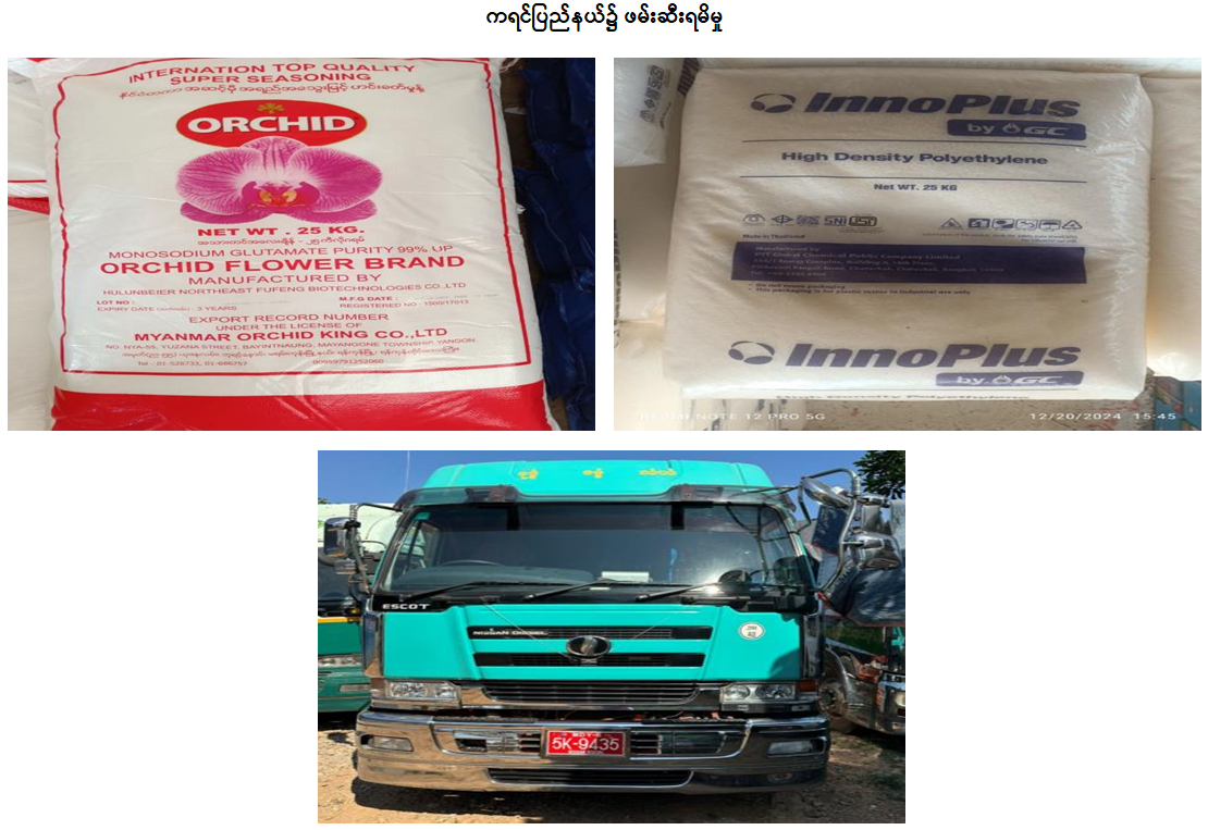 ၁။ တရားမဝင်ကုန်သွယ်မှုတိုက်ဖျက်ရေးဦးဆောင်ကော်မတီ၏ ကြီးကြပ်ကွပ်ကဲမှုဖြင့် တရားမဝင် ကုန်သွယ်မှုများကို ဥပဒေနှင့်အညီ ထိရောက်စွာ တားဆီးအရေးယူနိုင်ရေး ဆောင်ရွက်လျကရှိရာ ဒီဇင်ဘာလ ၂၀ ရက်တွင် မန္တလေးတိုင်းဒေသကြီး တရားမဝင်ကုန်သွယ်မှုတိုက်ဖျက်ရေးအထူးအဖွဲ့၏ စီမံခန့်ခွဲမှုဖြင့် တာဝန်ကျပူးပေါင်းအဖွဲ့များကစစ်ဆေးမှုများ ဆောင်ရွက်ခဲ့ရာ ကျောက်ဆည်မြို့၊ မြို့ရှောင်လမ်း၌ မော်တော်ယာဉ် (၁) စီးပေါ်မှ တရားဝင်စာရွက်စာတမ်းအထောက်အထား တင်ပြနိုင်ခြင်းမရှိသည့် လုပ်ငန်းသုံးပစ္စည်း (၄) မျိုး၊ လူသုံးကုန်ပစ္စည်း (၃) မျိုး (ခန့်မှန်းတန်ဖိုးငွေကျပ် ၃၇,၁၈၀,၆၄၅) နှင့် အဆိုပါပစ္စည်းများ တင်ဆောင်လာသည့် Hino Profia Truck (၁) စီး (ခန့်မှန်းတန်ဖိုးငွေကျပ် ၃၀,၀၀၀,၀၀၀) ကိုလည်းကောင်း၊ ရန်ကုန် - မန္တလေးအမြန်လမ်း မိုင်တိုင်အမှတ် (၃၆၆/၆)၊ တံခွန်တိုင်အဝိုင်းအနီး၌ မော်တော်ယာဉ် (၁) စီးပေါ်မှ တရားဝင်စာရွက်စာတမ်းအထောက်အထားတင်ပြနိုင်ခြင်းမရှိသည့် လုပ်ငန်းသုံးပစ္စည်း (၇) မျိုး၊ လူသုံးကုန်ပစ္စည်း (၃) မျိုး (ခန့်မှန်းတန်ဖိုးငွေကျပ် ၃၄,၈၉၅,၀၀၄) နှင့် အဆိုပါပစ္စည်းများ တင်ဆောင်လာသည့် Sung Long Bus (၁)စီး (ခန့်မှန်းတန်ဖိုး ငွေကျပ် ၇၀,၀၀၀,၀၀၀) ကိုလည်းကောင်း၊ မန္တလေးဘူတာကြီး၌ ရန်ကုန် - မန္တလေးအဆန်ရထား၊ ပါဆယ် (၁) ရထားတွဲပေါ်မှ တရားဝင်စာရွက်စာတမ်းအထောက်အထား တင်ပြနိုင်ခြင်းမရှိသည့် လူသုံးကုန်ပစ္စည်း (၄) မျိုး (ခန့်မှန်းတန်ဖိုးငွေကျပ် ၄၄,၀၁၇,၀၀၀)ကိုလည်းကောင်း၊ စုစုပေါင်း (ခန့်မှန်းတန်ဖိုးငွေကျပ် ၂၁၆,၀၉၂,၆၄၉) ကို ဖမ်းဆီးရမိခဲ့ပြီး အကောက်ခွန်လုပ်ထုံးလုပ်နည်းများနှင့်အညီ အရေးယူဆောင်ရွက်လျက်ရှိပါသည်။
